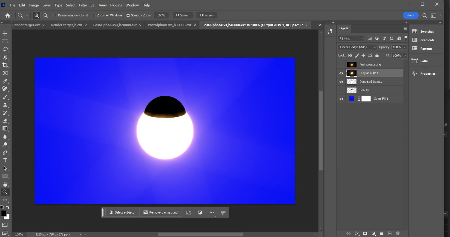 In this way, in Photoshop, you just need to Linear Add the Out1 AOV on top of the Beauty, or Denoised Beauty AOV: