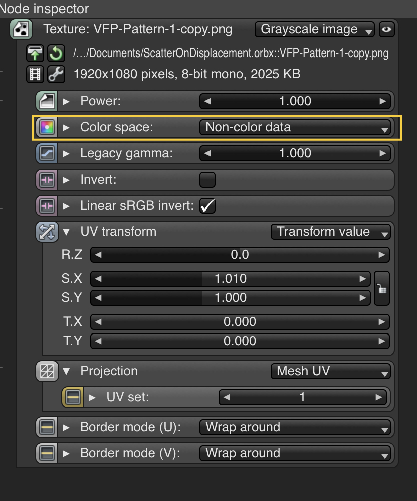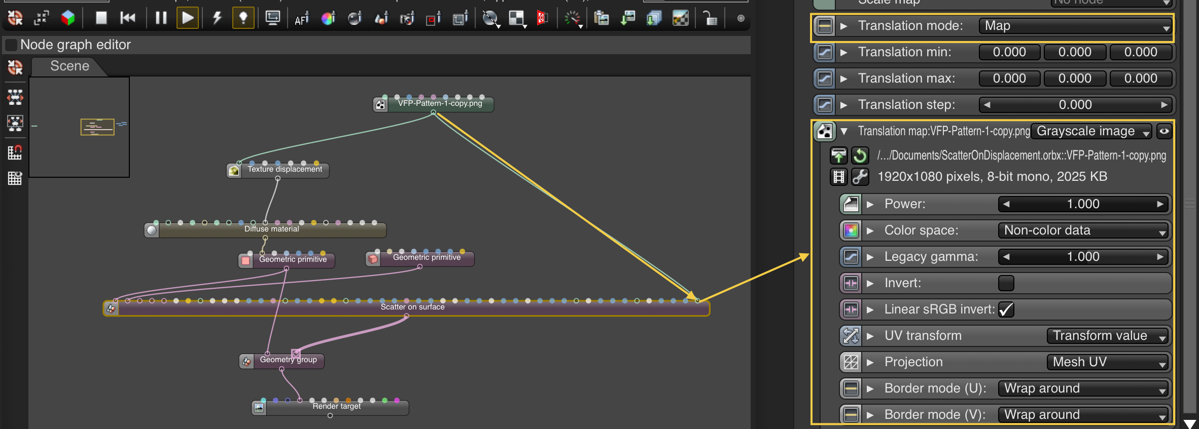 Then we need to set the Translation mode of the Scatter on Surface node to "Map", and connect the texture used for displacement also to Translation map pin: