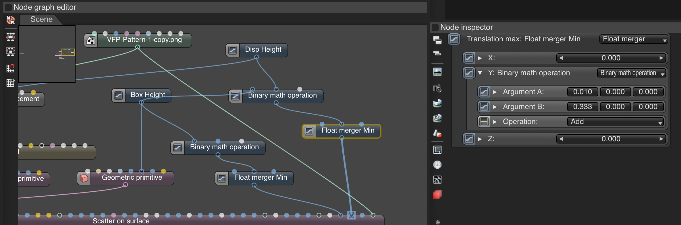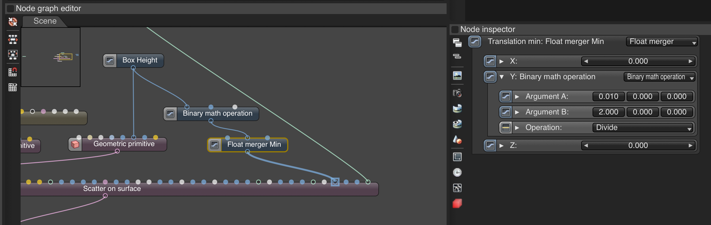 Then use a "Float merger" node to connect the "Binary math operation" node to the Y pin, and connect the "Float merger" to the Translate min pin: