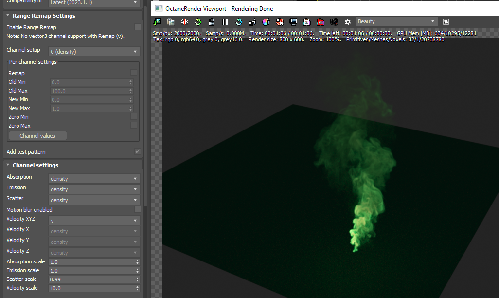 The resulting VDBs have the up axis as Y instead of Z, so the OctaneVolume object has been rotated to compensate.
