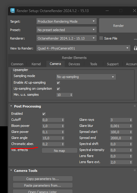 When using Octane Render with shadow catcher and chromatic aberration enabled, a bug occurs!