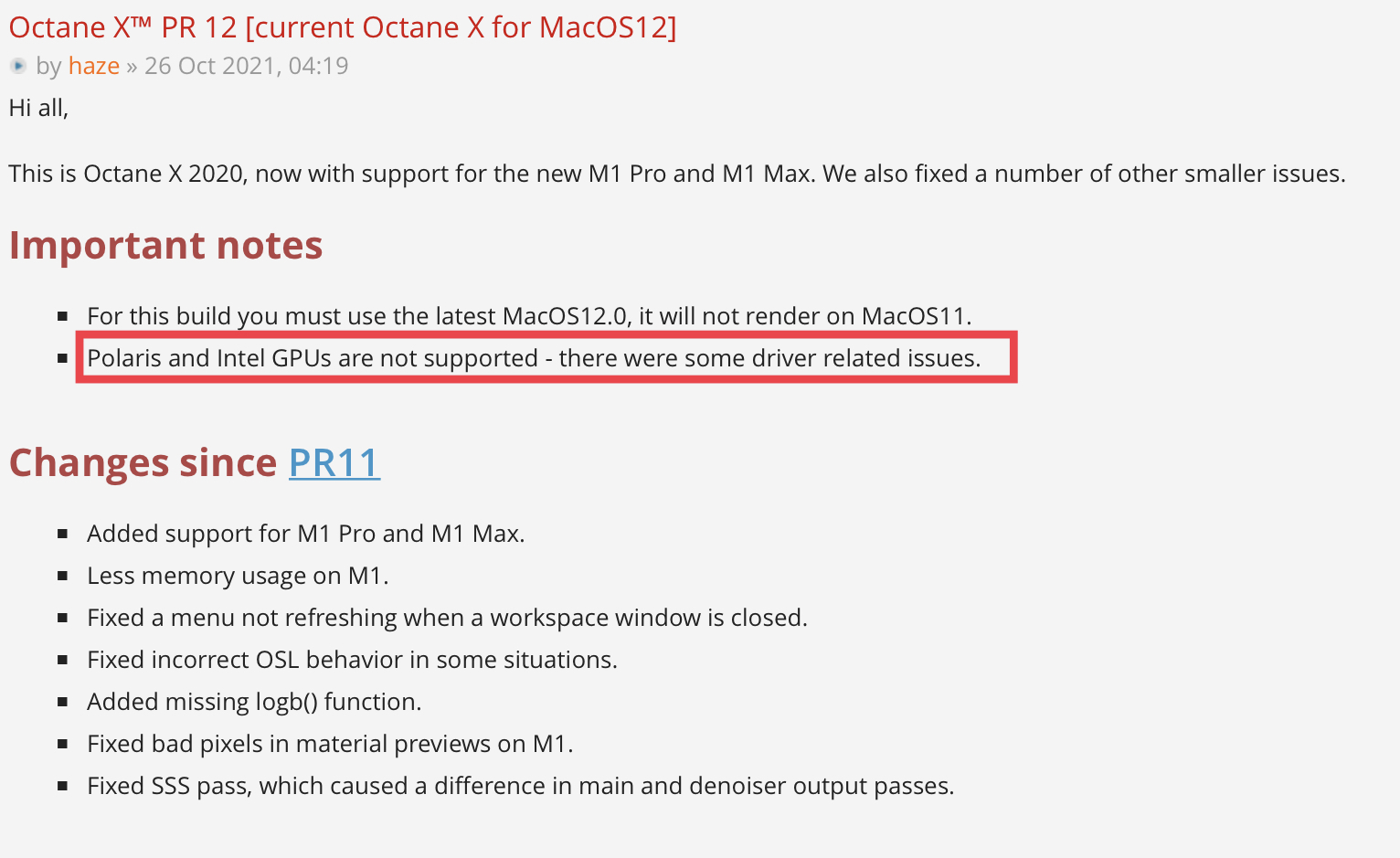 GPU support on macOS Monterey+: As Beppe mentioned, OctaneX PR12/13 dropped support for older AMD/Intel GPUs. If you’re on macOS 12 and not running Vega/Navi/Big Navi or Apple Silicon, it will just fail to initialize (black screen every time).