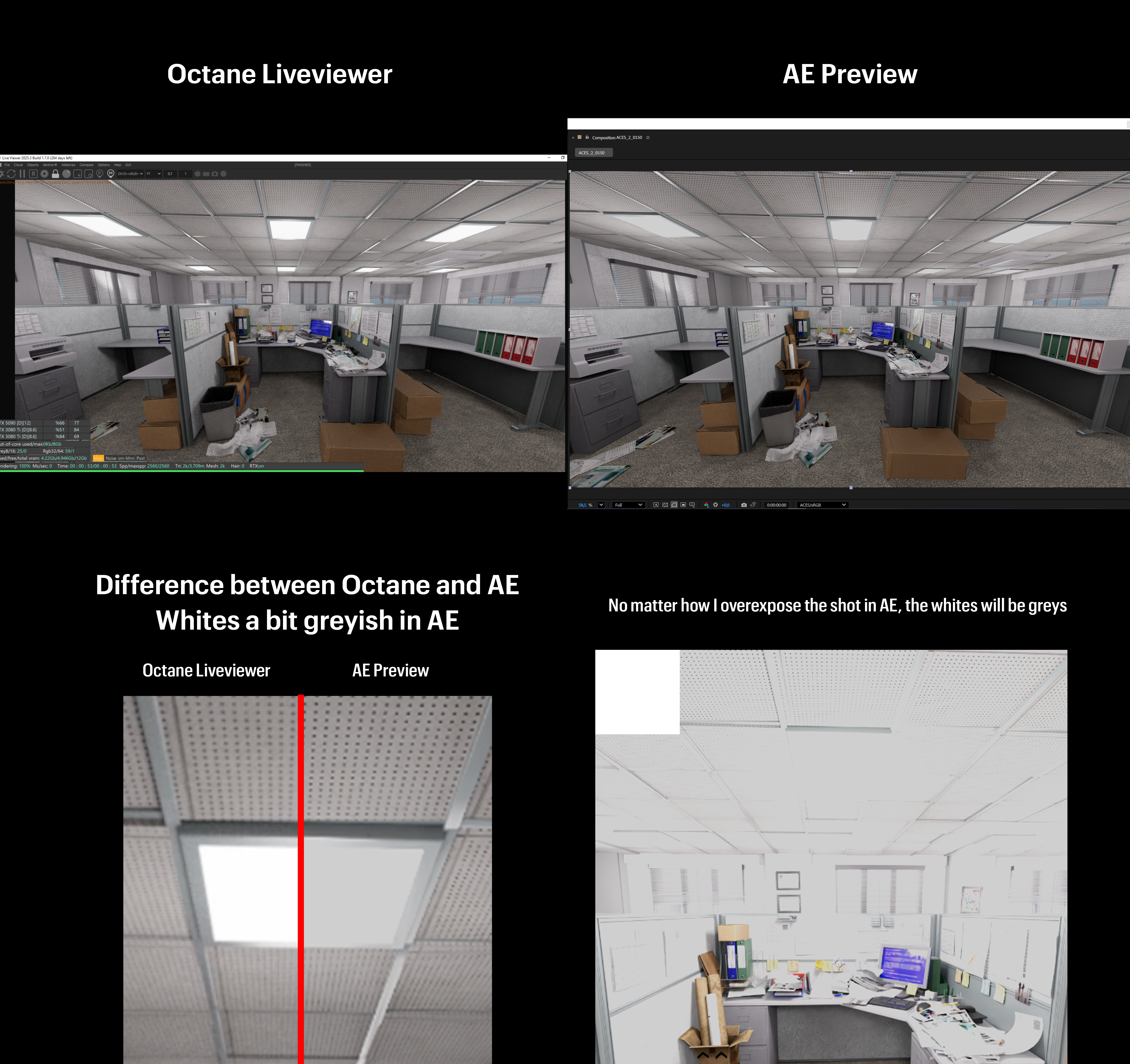 Everything should match, but my AE preview looks wrong. Whites look grey, and it’s definitely not the same as Octane’s Live Viewer.