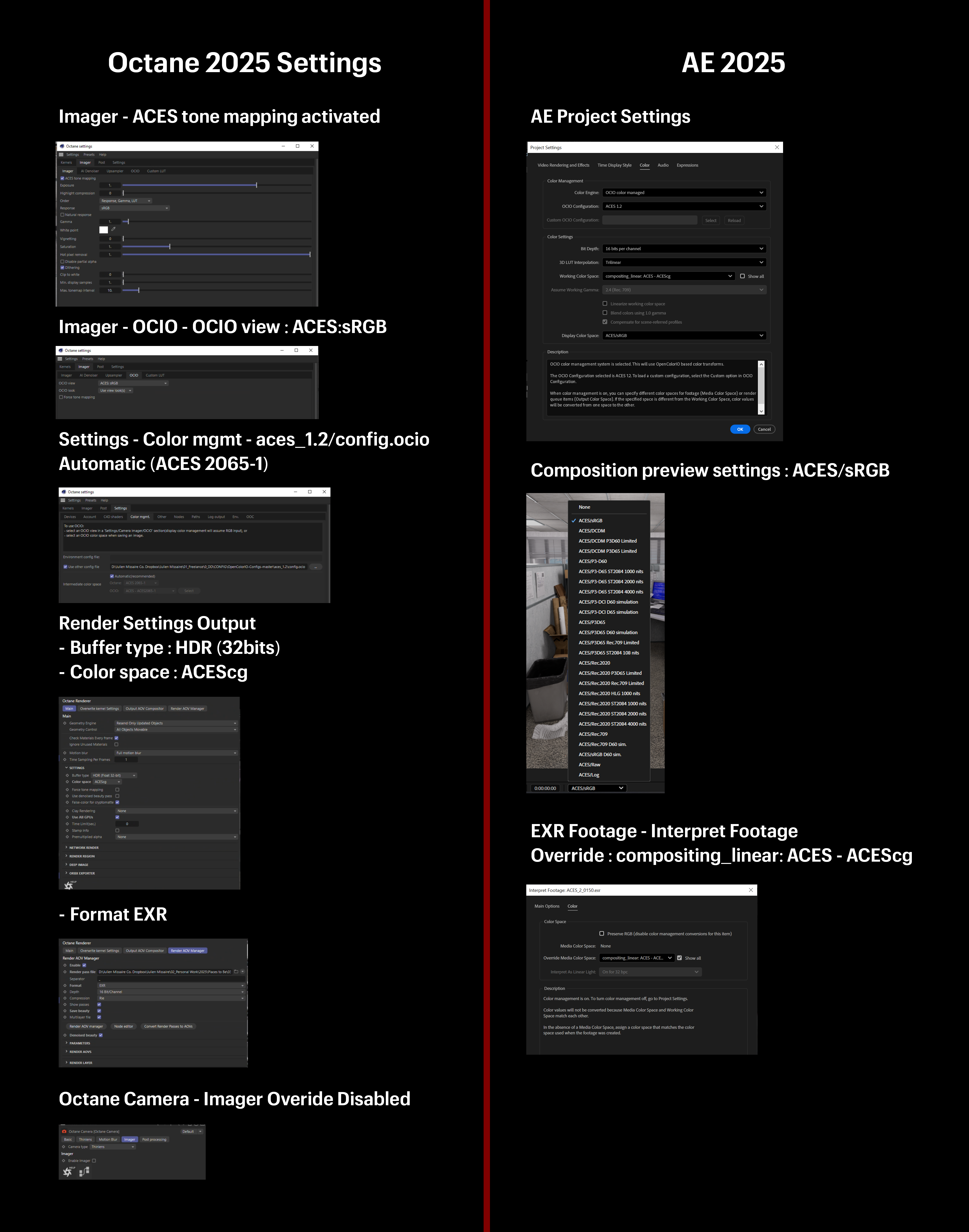 I’m struggling with a color mismatch between OctaneRender and After Effects when working in ACES 1.2. My EXR looks washed out in AE, with dull whites compared to the Octane Live Viewer.
