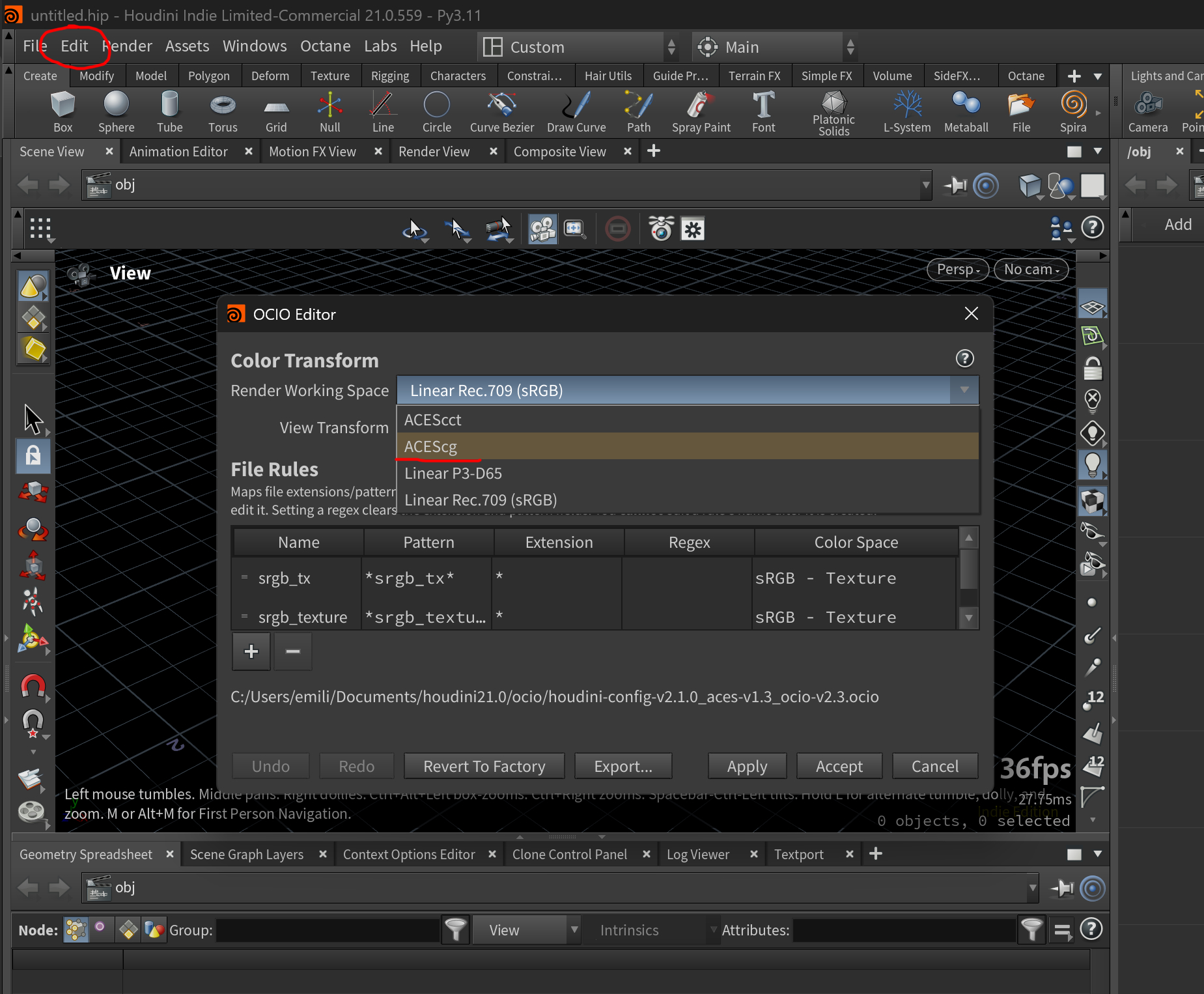 Houdini Color Settings set to ACES