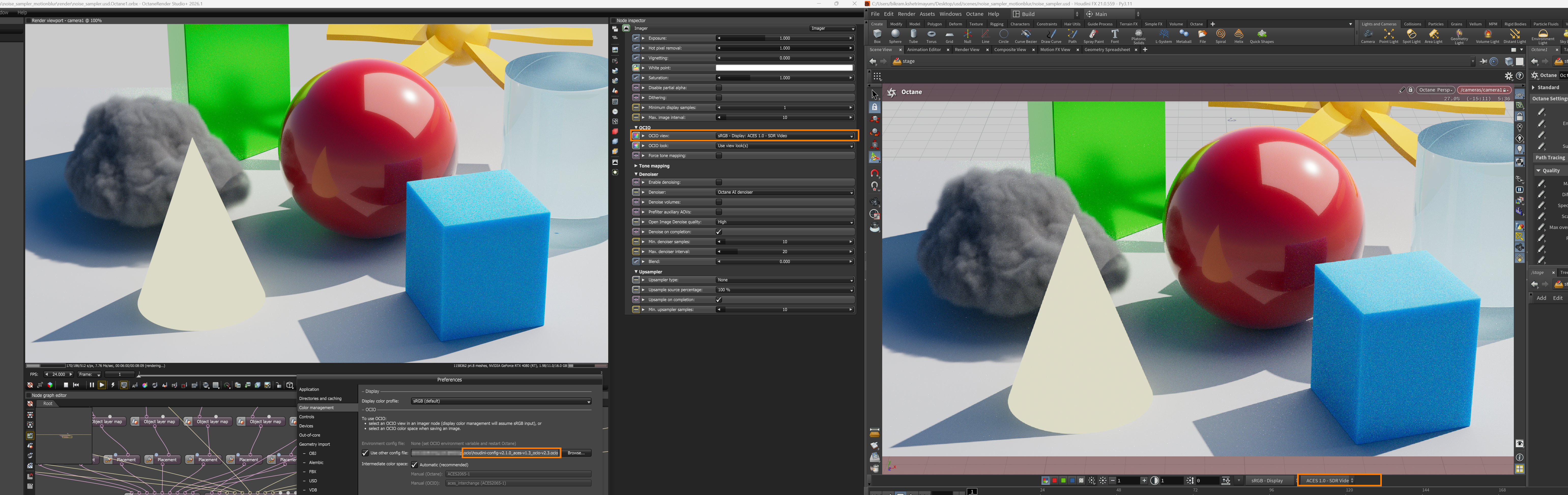 My issue is the following: as shown in the screenshot, since the Octane Camera Imager / Tonemapper is ignored in the viewport and the tonemapping is handled internally by Houdini, I’m trying to work correctly in ACES inside Solaris.