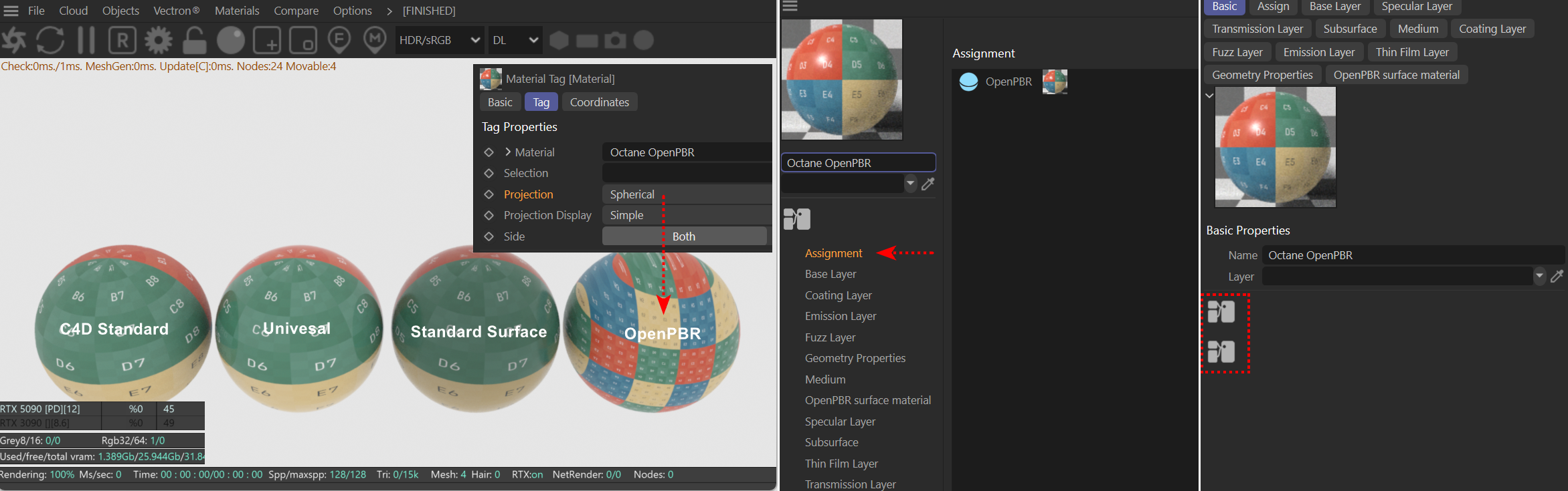1. When applying an OpenPBR material, the Texture Tag's Projection is changed to Spherical instead of UVW.