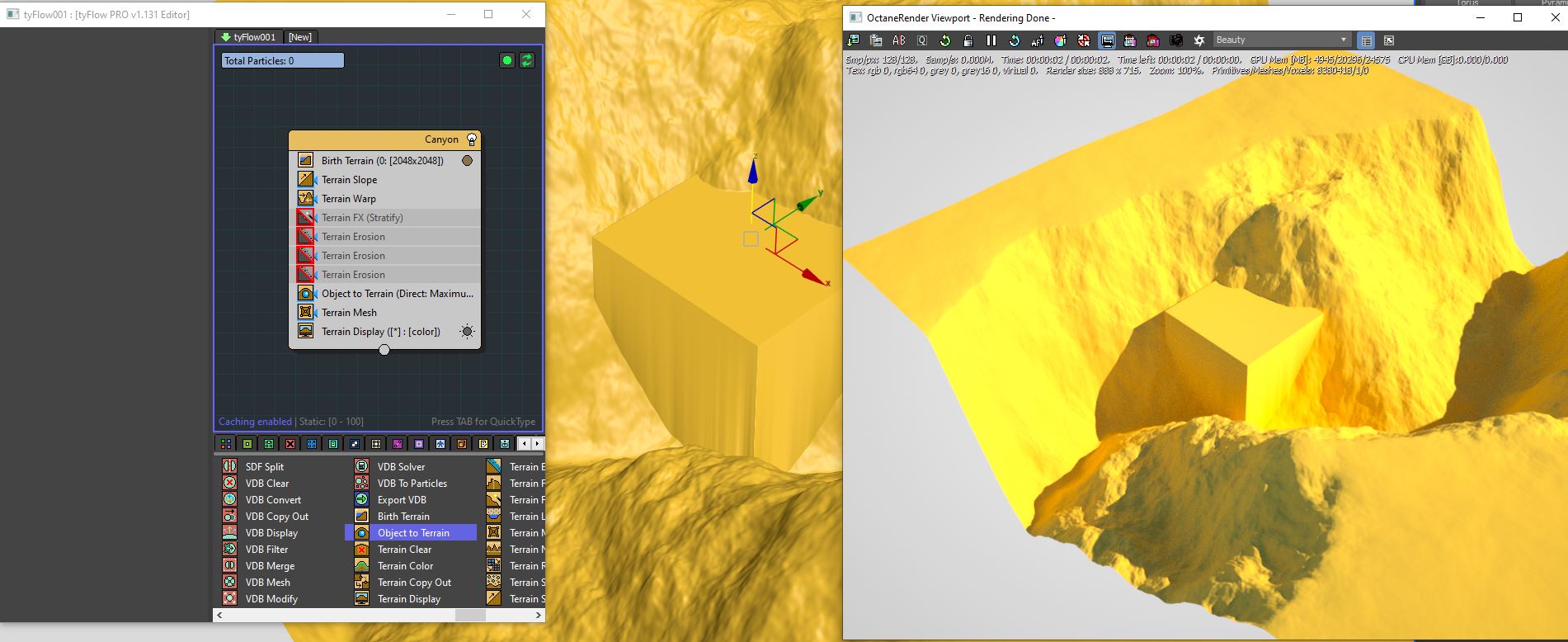 Currently, to use a TyFlow terrain, you need to disable the Particle interface.