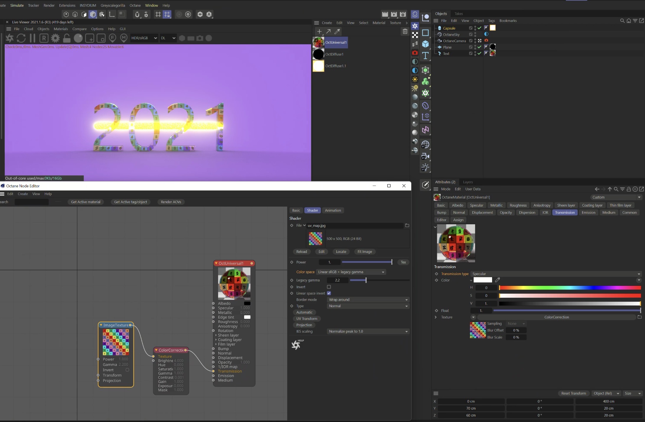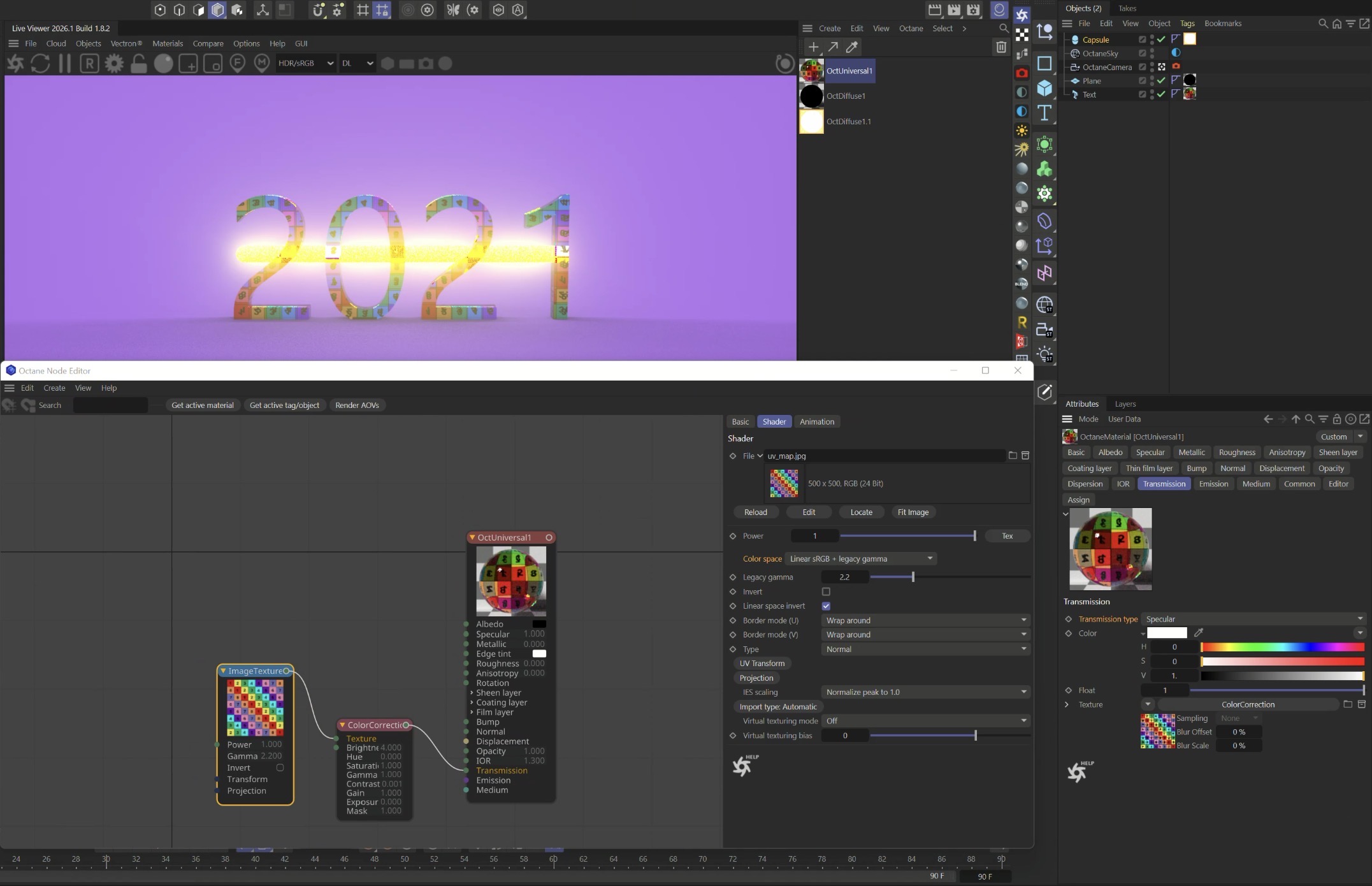 I have just tried to create a scene with c4doctane 2021.1.6-R3 in C4D R26, with ImageTexture node and an Universal material with Transmission type set to Specular: Then opened with C4D 2026 and OctaneRender plugin 2026.1-v1.8.2, and both color space and transmission type are correct: In general, if you are having issues with previous scenes, please note that you can also select all the materials, and in the Basic tab you can change the compatibility mode to a previous version: And you can do the same also in Kernel settings: ciao,