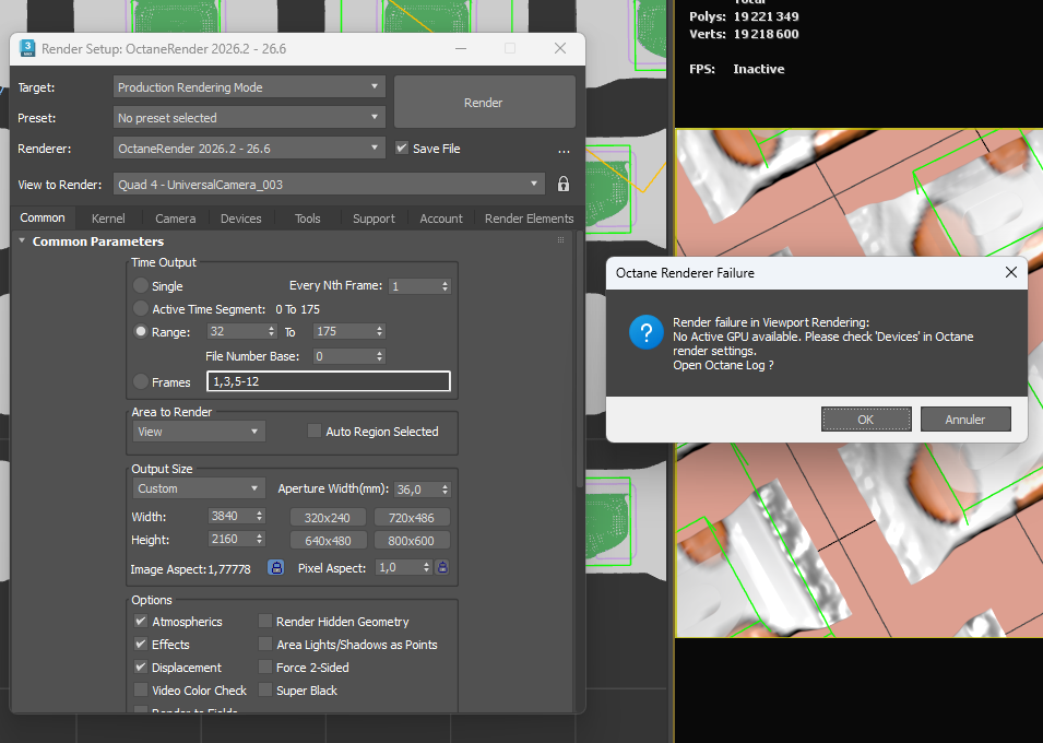When I relaunch 3ds Max, I have an error telling me that I have no active GPU, please see the screenshot and the Octane log.