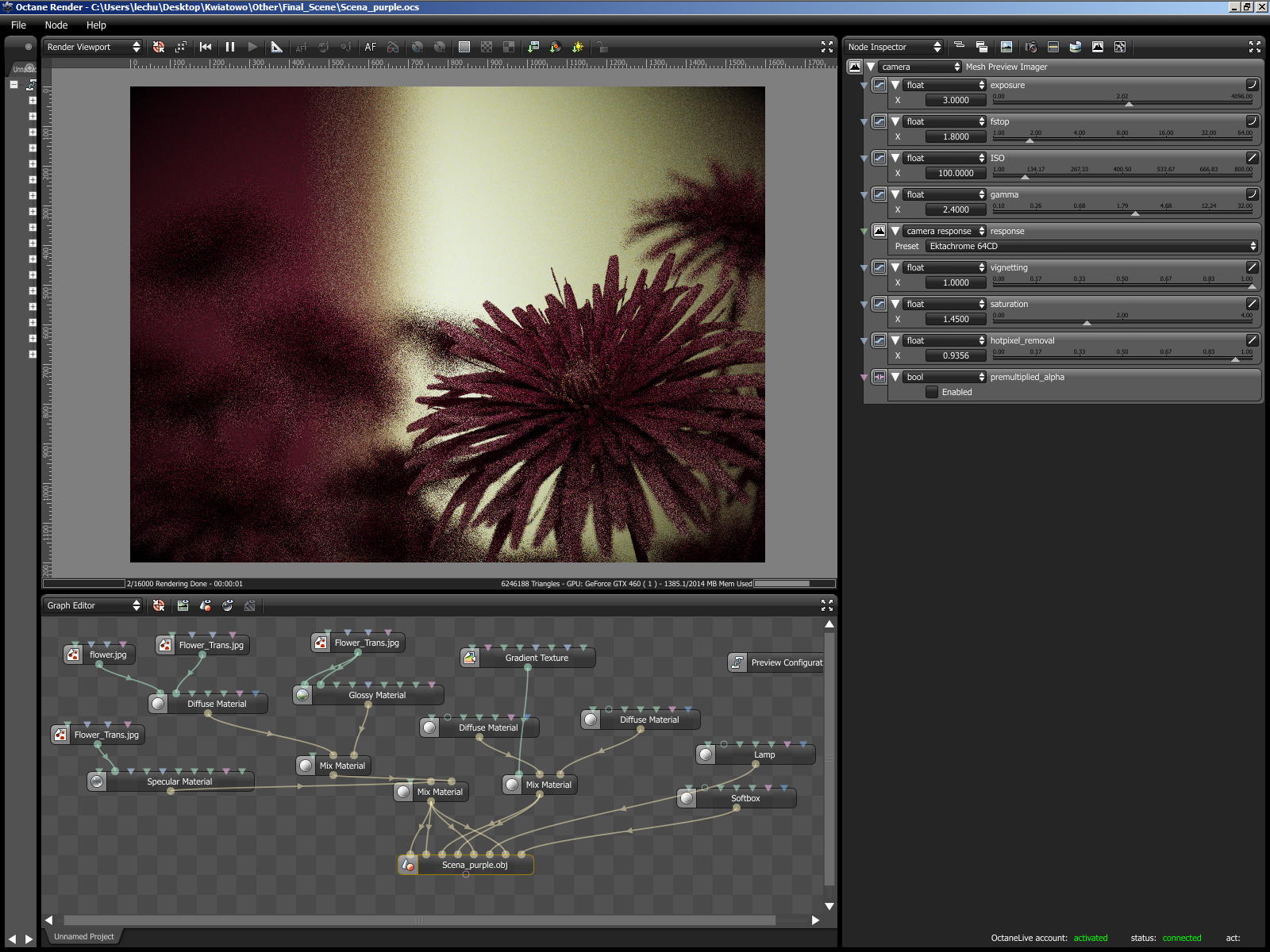 Each flower has about 800 000 triangles (after subdividing the meshes), so the shots had from about 2 to 6 milion triangles + 4k textures. Scene was lit by two mesh emitters (one with painted gradient) and in some instances, by delicate RGB value of the background. These are pure renders, without any Photoshop tweaks (aberration etc.). Render times are written below each image. I also include viewport screenshot with material nodes I used to achieve translucency effect, and color grading.