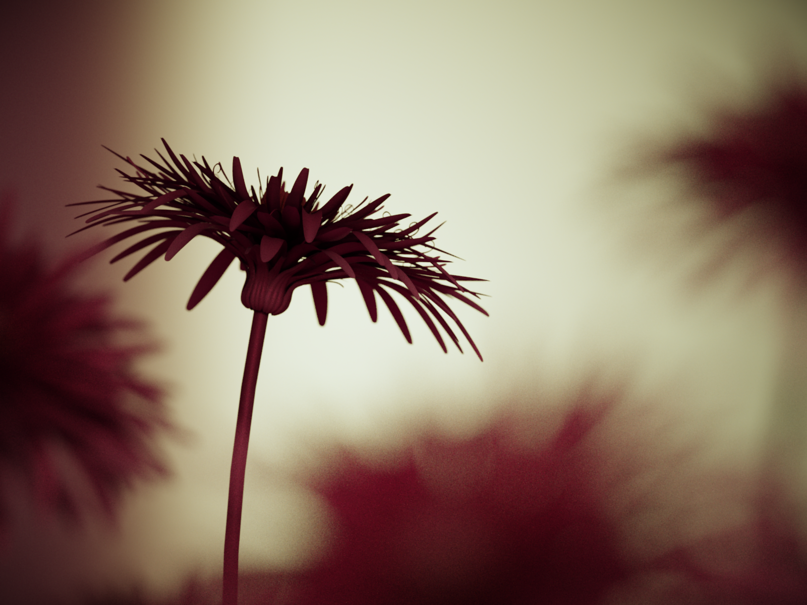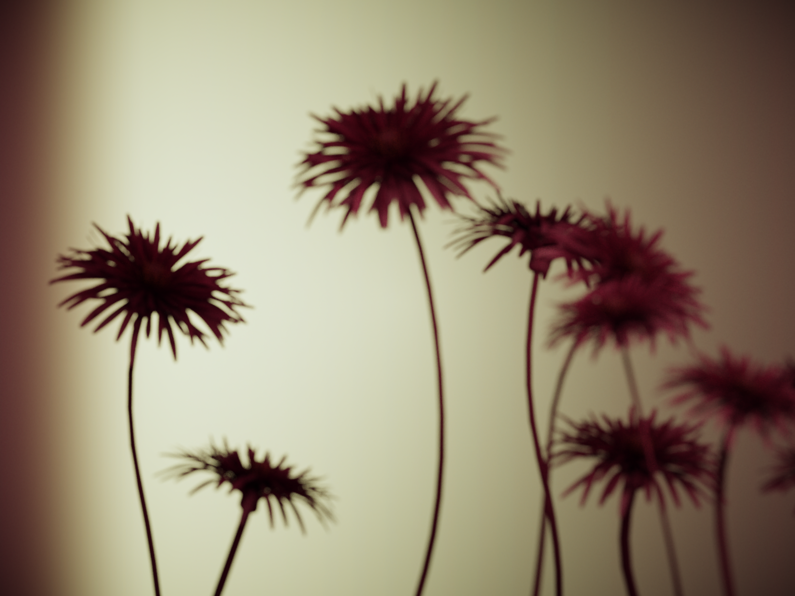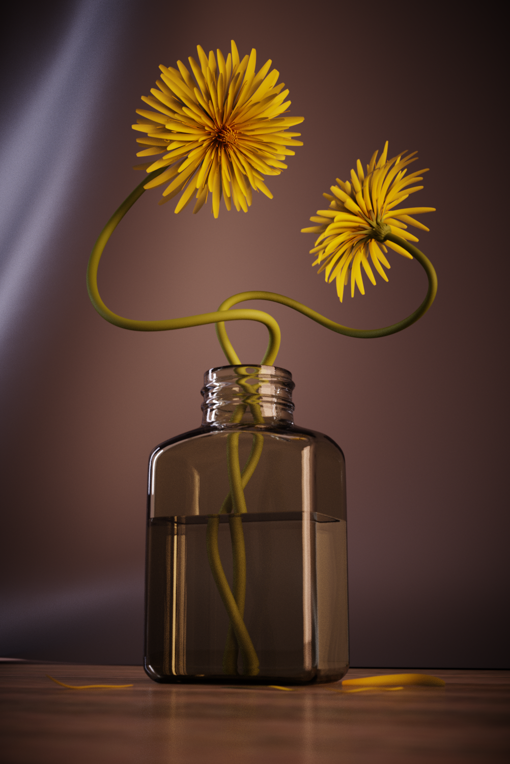 The idea came from wondering what birthday present may I make to my spouse (we live quite far away from each other right now +- 1400 km). Actually I got inspired by very simple and modest painting of two sow thistles being put into empty ink glass jar (unfortunately I can't find the image now, if this will be required, I hope I'll manage to browse it somewhere in the net) but mine version was about to show them dancing with each other. I wanted the render to look like a still life type of image or painting, so I've modeled my flowers, the scene and later on played with composition, including not only the one I've described