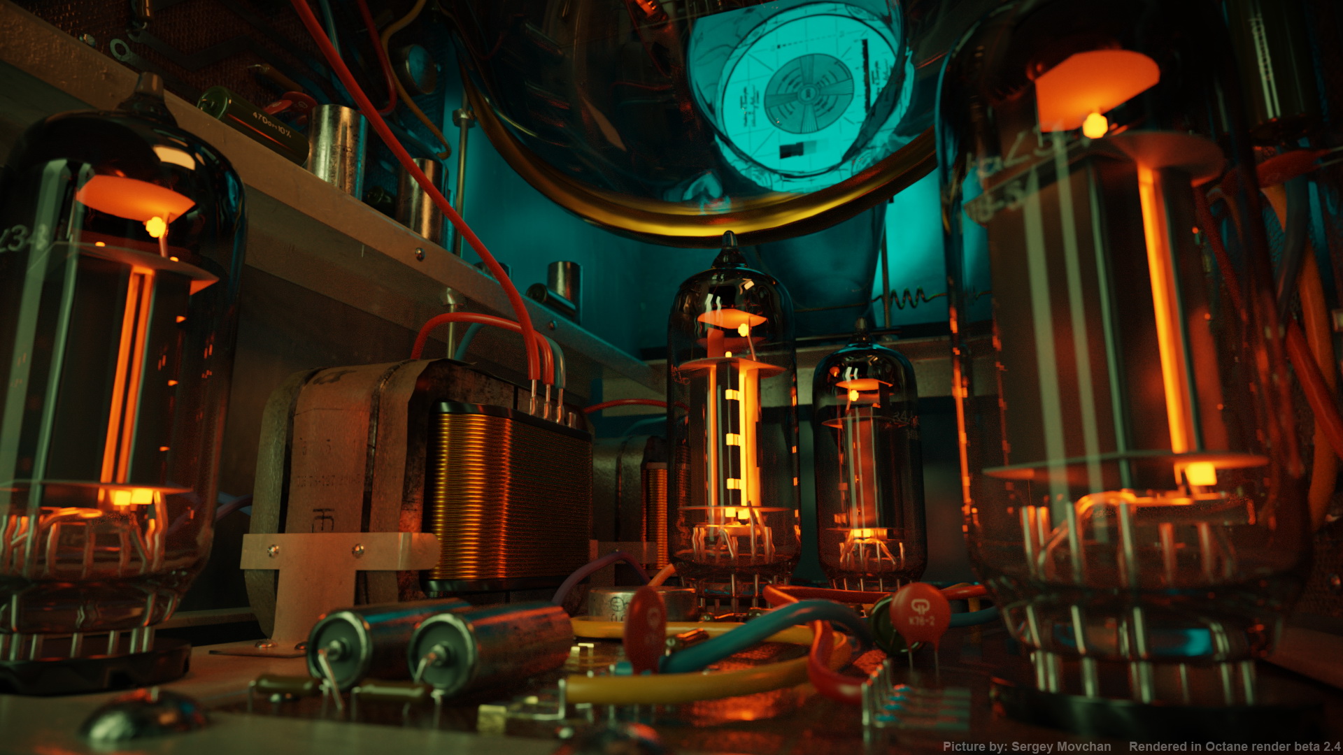 Inspiration: Some time ago we did few effects for documenal film about Vladimir K. Zworykin (He was a Russian-American inventor, engineer, and pioneer of television technology) and this scene was used as background for presenter. It shows inside of iconoscope (early television camera tube). Scene doesn't pretend for any historical accuracy (wrong radio components for that period of time, there aren't holes for elements in plate etc :)) and it's been done for visual purpose only. Main goal of this render is testing of Octane render in hard conditions - lots of complex emitters inside the glass, lots of glossy reflectors and elements, dof. Eventually, I'm very satisfied with results - I couldn't stop myself from taking pictires - that's real "octane magic". Thank you, guys :)