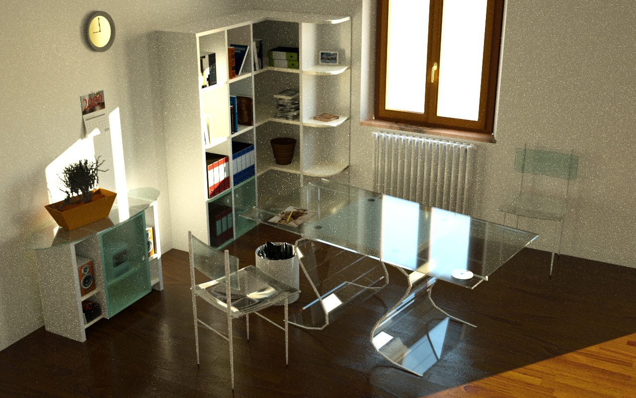 This is my rendering after 20.000 samples (pathtracing depth 12), i have the sunlight in the windows and door(out of visual in the right corner) the sunlight is set power 11.0 and in the window i have glass opacity 0 and the emitter surface(light ambient) with power 0.5 and 6500k°..