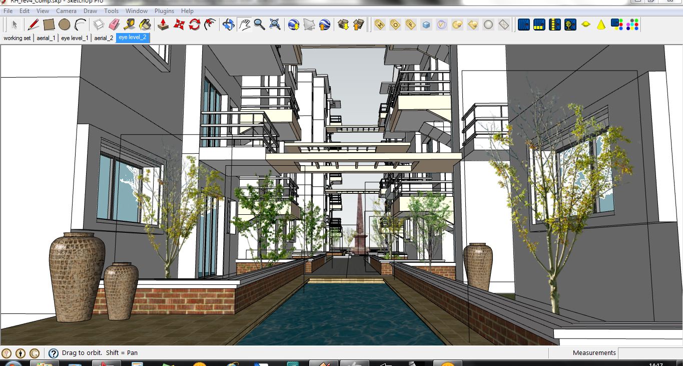 its a simple scene, a midrise apartment with central pedestrian street- with a small area as reflective pool, and low-height boundaries. its interconnected at upper levels with pergolas to give a more 'enclosed' feel...