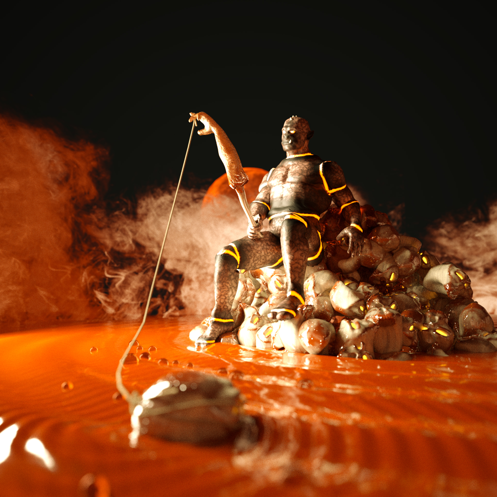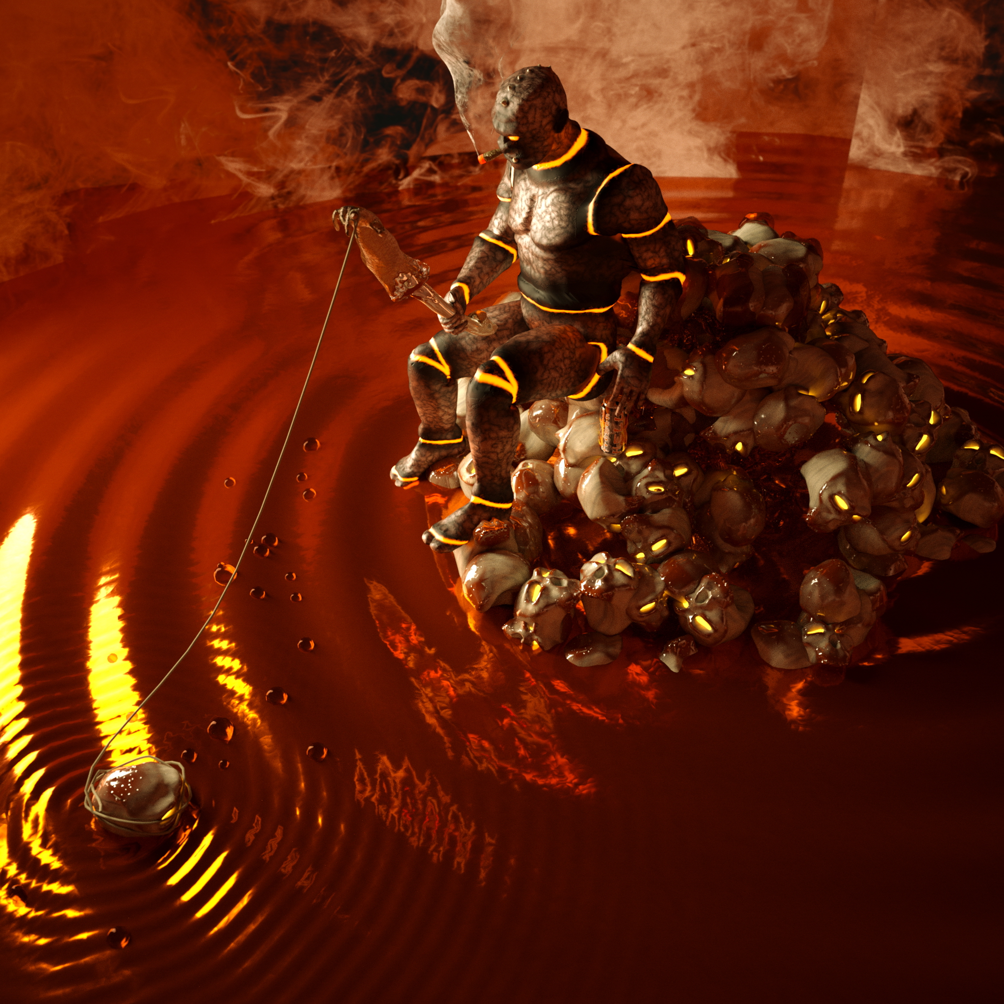 Well, I've said it before, I have tons of fun with sculptris and Octane. So since the competition was extended I thought of doing something else. I had this demon character I did some time ago to play with both apps, but at the time there was no mix material, so It didn't quite look right and my girl suggested to use it to do a Hellboy-like scene. I gave it some thought and came up with the idea of making this small "cosy" scene of a demon resting after having some "fun". I wanted to have a "comic" look rather than being realistic. So I modeled a basic skull and using particles created this small pile with them, then I used more particles to create some blood pouring from the top, a basic water pond, and reuse the moon from my first scene and did the first tests. The demon was ok, but it wasn't what I had in mind so I went back and after 2 more tries I modeled one more atoned with the picture in my head. Then, heck, I thought, sure, I've got a demon, but what the fruit is he doing there, so I thought, well, since he's taking a break, why not having him fishing (in my experience fishing is one of those boring activities that hell has reserved for lawyers and politicians) and gave it a kind of Huckleberry Finn theme. So I modeled the fishing rode and used one of the skulls as bate.