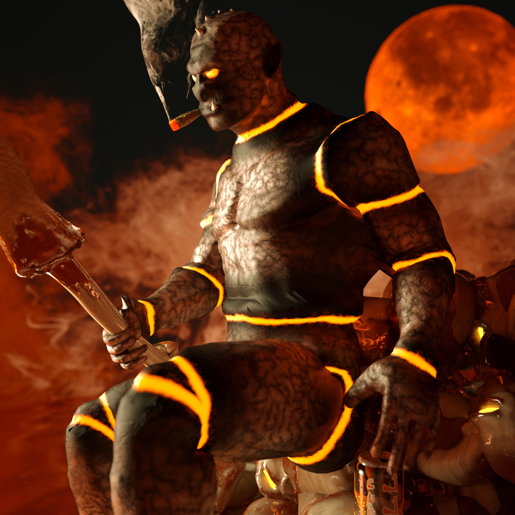 now for the wips and materials, basically I've added a difusse emmiter to anything I could think of, the enclosing fog, the moon (low temp for the red color), the demon's skin, the skull's, the cigar's tip, plus an out of frame plane for some extra almost white light.