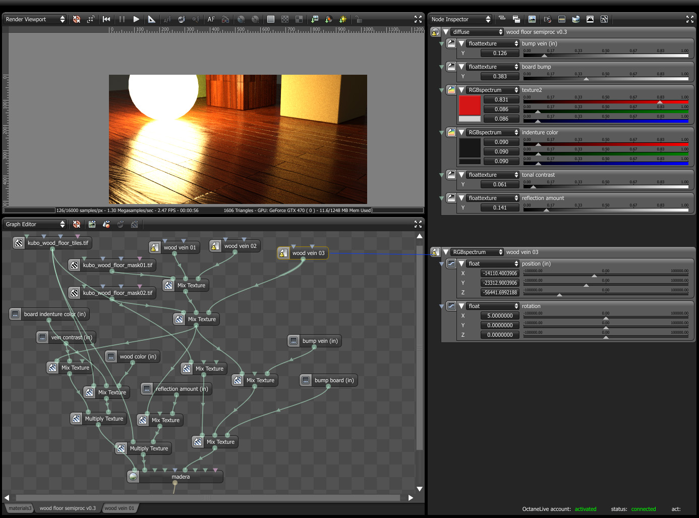 Besides some minor tweak the main thing is that I've added the board randomness in a way. For now I'll wait till we have some more nodes like global scale control, and random tiles and float texture gets fiexed to get lower values so I can add control to roughness and such so I can convert it to fully procedural. I have to say that I'm pleased with the results, and even thou I might need to tweak it further it looks close to what I had in my head (which is a lot).