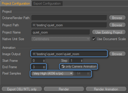 To render the tiles we use the animation rendering. To do that, switch to the project configuration of the export plugin and specify the name of the output images, the pixel samples (== quality) you want to render for each tile, enable camera animation as we only have to change the camera settings between two frames and specify a range of 0 ... 3/8/15/24 (depending on the amount of tiling you chose):