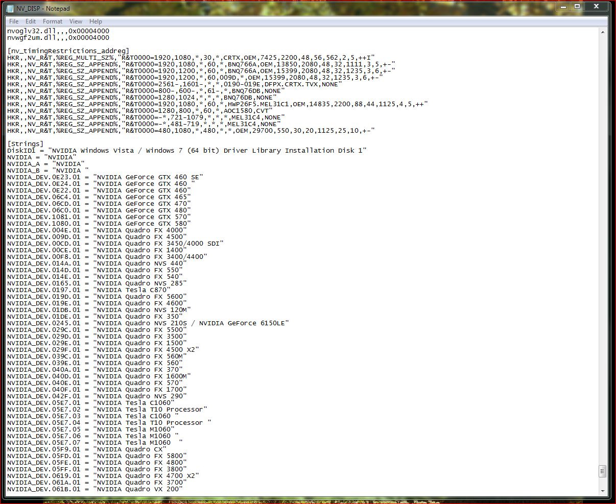 As you will see.This file has been hacked to include the Geforce GTX460SE right up to the GTX580 so that when you run the Quadro driver installer,it will recognise your Geforce card.