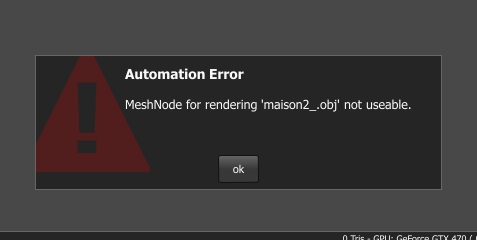 Just for your information: You get the automation error, if the exporter tries to select a mesh node that doesn't exist. In your case it tries to select a mesh node maison2_.obj. I guess, you originally exported the scene with the project name maison2.ocs and then renamed the OCS file to maison2_.ocs, while the mesh node is still called maison2.obj.