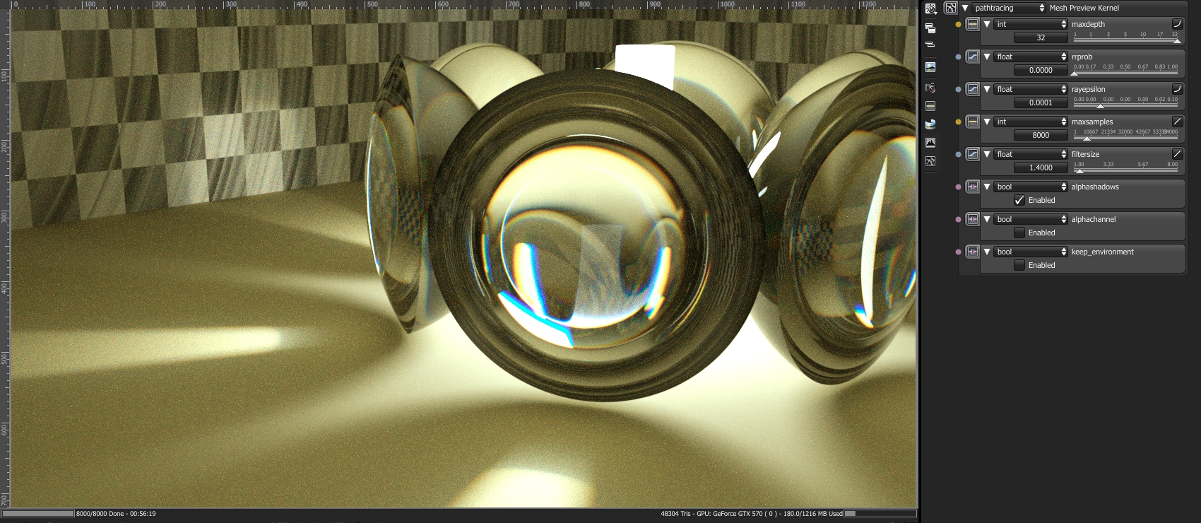 Here are three renders to test the different kernels, each 8000 samples/px. Other settings can be seen from the screenshots.