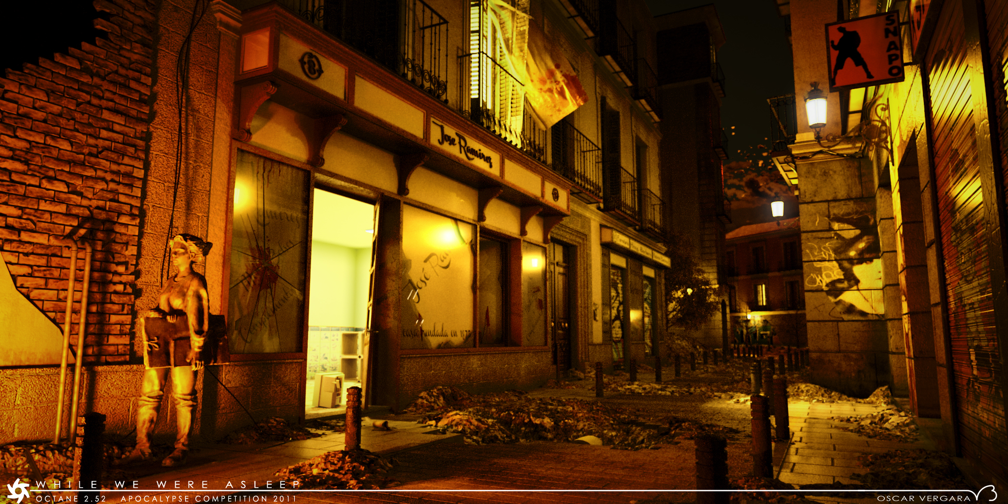 You can see a more detail explanation on the wip thread, basically the whole street modeled in SU, debris and sculpture in sculptris, moon and curtain in max, and all mixed and exported from max. Tree, and props inside the shop are from googleware house, textures either hand painted, from my personal photos from some real jobs in buildings in that area or at least the same tipology, and heavily modified downloaded from cgtextures.