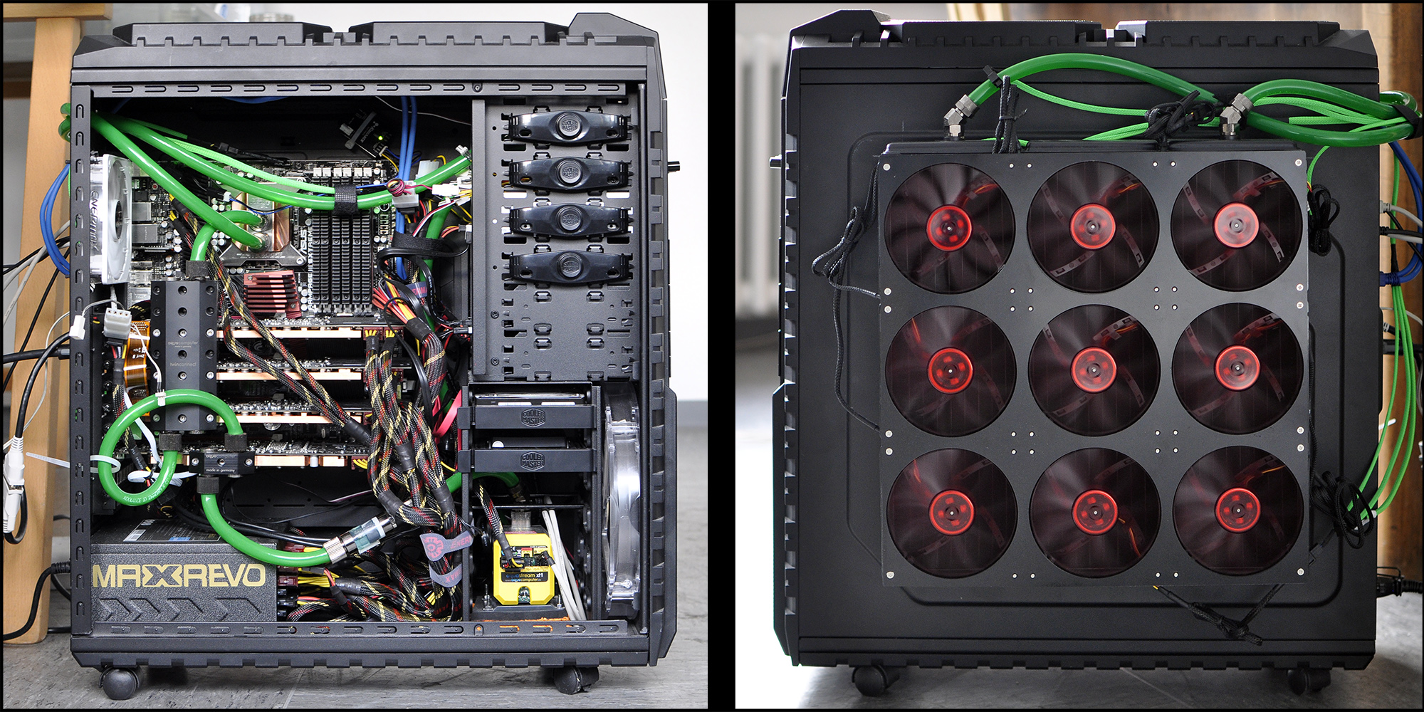 I could buy 4 evga with waterblock embedded, but how connect 2 processors + 4 gtx all together? How can I calculate the power? how big must be the radiator? Do I need single radiators inside the case or one big external unit?.
