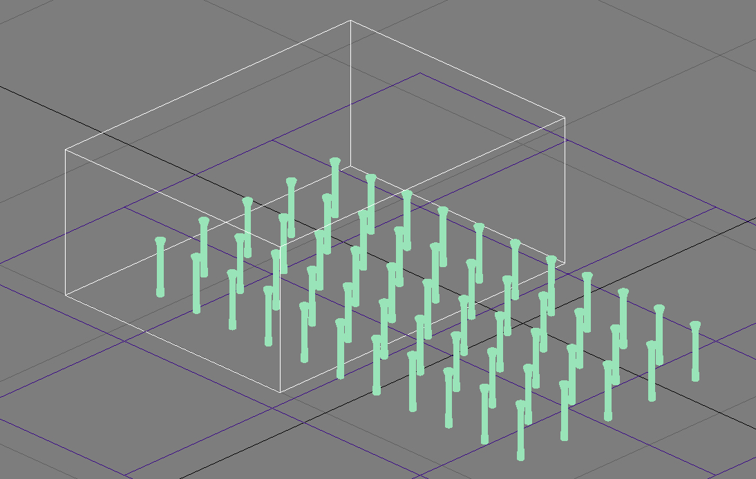 The scene is a quick model with an array of pillars, a base plane and a box to depict the volume fog. I've left some pillars out to best see the effect.