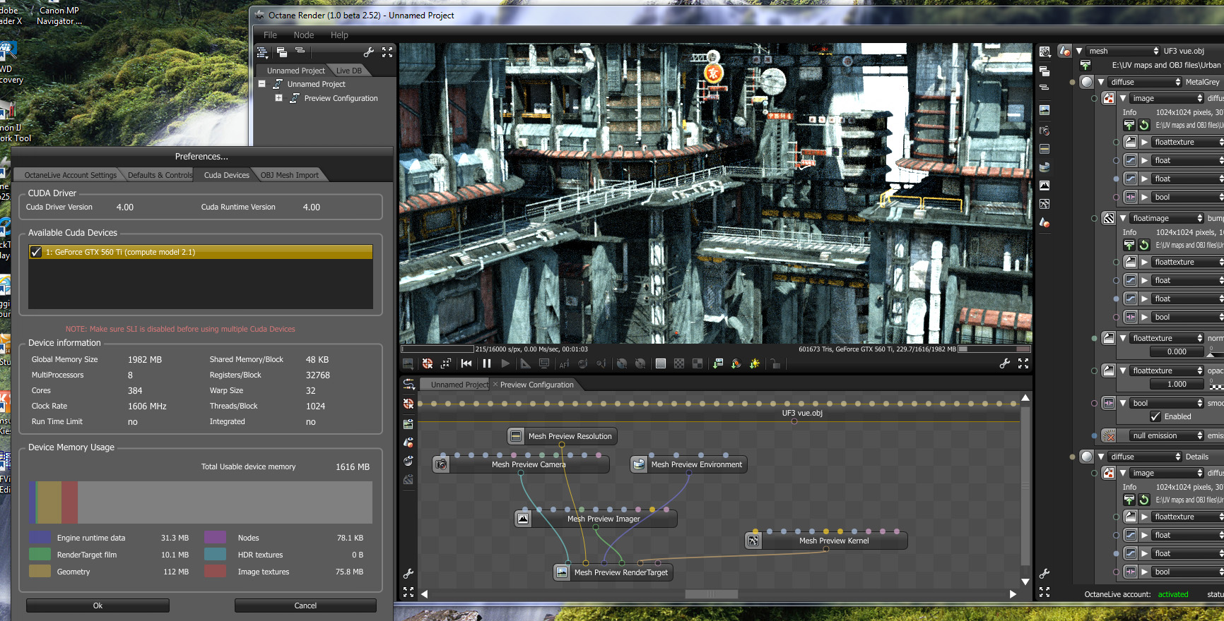 to quit windows aero, you need to open the windows services panel and stop the desktop window manager. you can do this also using a batchfile (net stop UxSms), to stop it everytime you start octane. if you have an 800mb mesh, it'll imo hardly ever fit into that ~850 mby you get out of a 1gb card. my biggest one to date was a little over 600mb/7mio tris and already uses 1.2gb vram - without textures.relox wrote:yeah im using windows 7 64 bits i dont know if its aero windows but its the last windows 7 version, how do i quit aero or windows 7 to get more vram? im only have one monitor and yeah its 1920x1080 resolution thanks!!! convergen yeah thats resolve my help!!!! alot and my obj file is 793mb thats not a big file size. kubo i have the last drivers from nvidia and the last cuda version to run octane. convergen i will try to low my resolution monitor maybe im using more processes thats why im not getting the real memory display.
