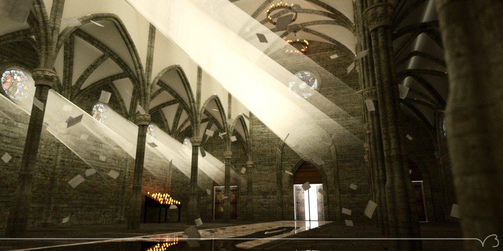 a small update, I've added almost all the objects to the scene. It needs some tweaking, and I'm waiting for 2.6 to add the rest of the cathedral modules, because now I can only use 4 before it all goes boom ;P . Since it's a tricky interior shot, and geometry is topping my vram I'm getting 0.15 Ms/sec which is slow as hell (single 570), this took 8hr for 1500 samples (I was away, so probably solved with less samples). Also I got it up from 0.1 to 0.15 (which is a lot) by fixing the geometry, around the windows I was getting light leaks cause it wasn't properly joined, hence it was having trouble calculating some extra light intakes. Portals added extra .02, which was good too.