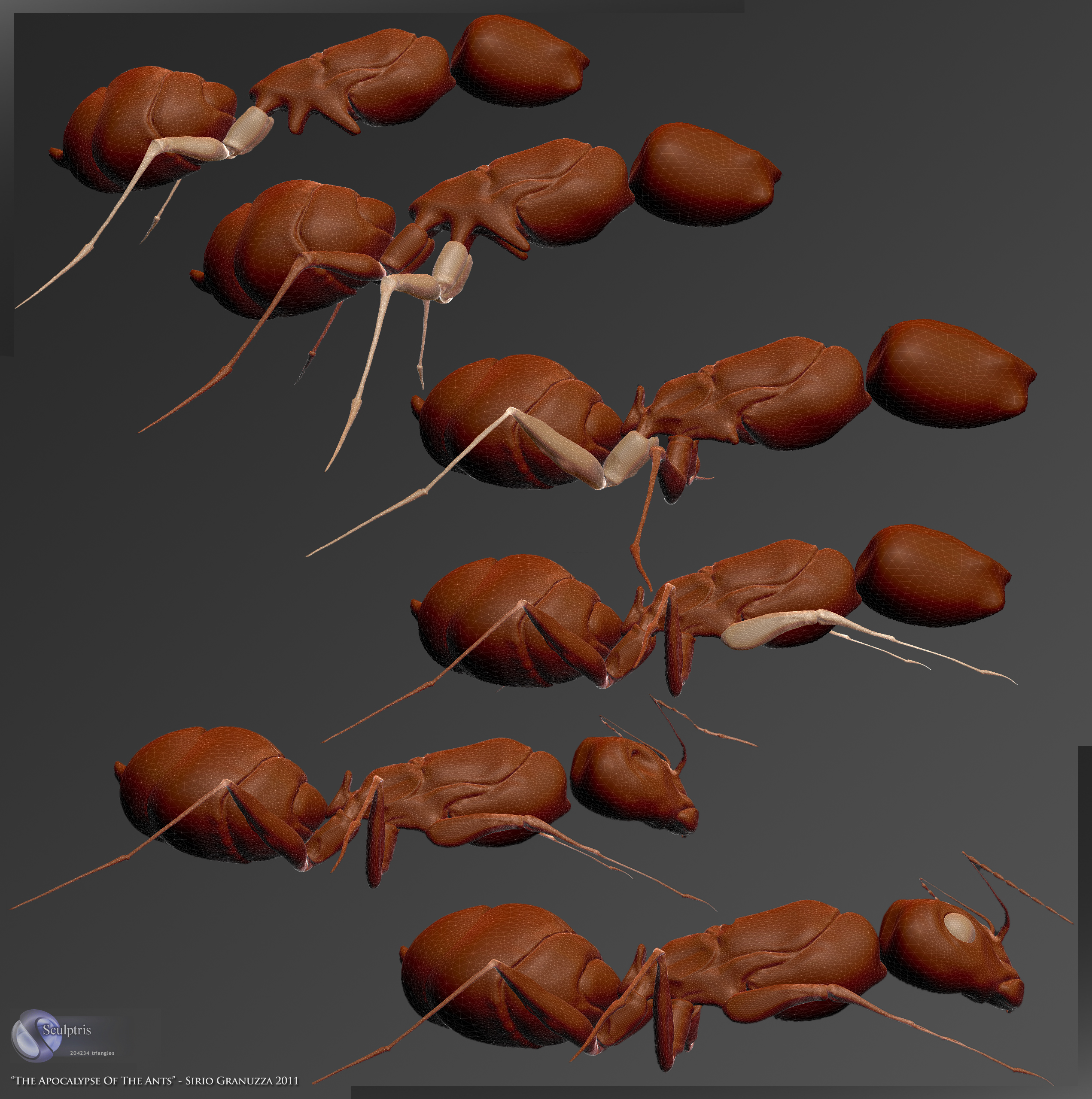 it looks nasty that ant nice modeling, I think something really creepy and apocalyptic could come out of it, B movie type of thing. Just a minor complain, the "legs" are a little too thin in the extremes compared to the reference photo, besides that, really neat model.