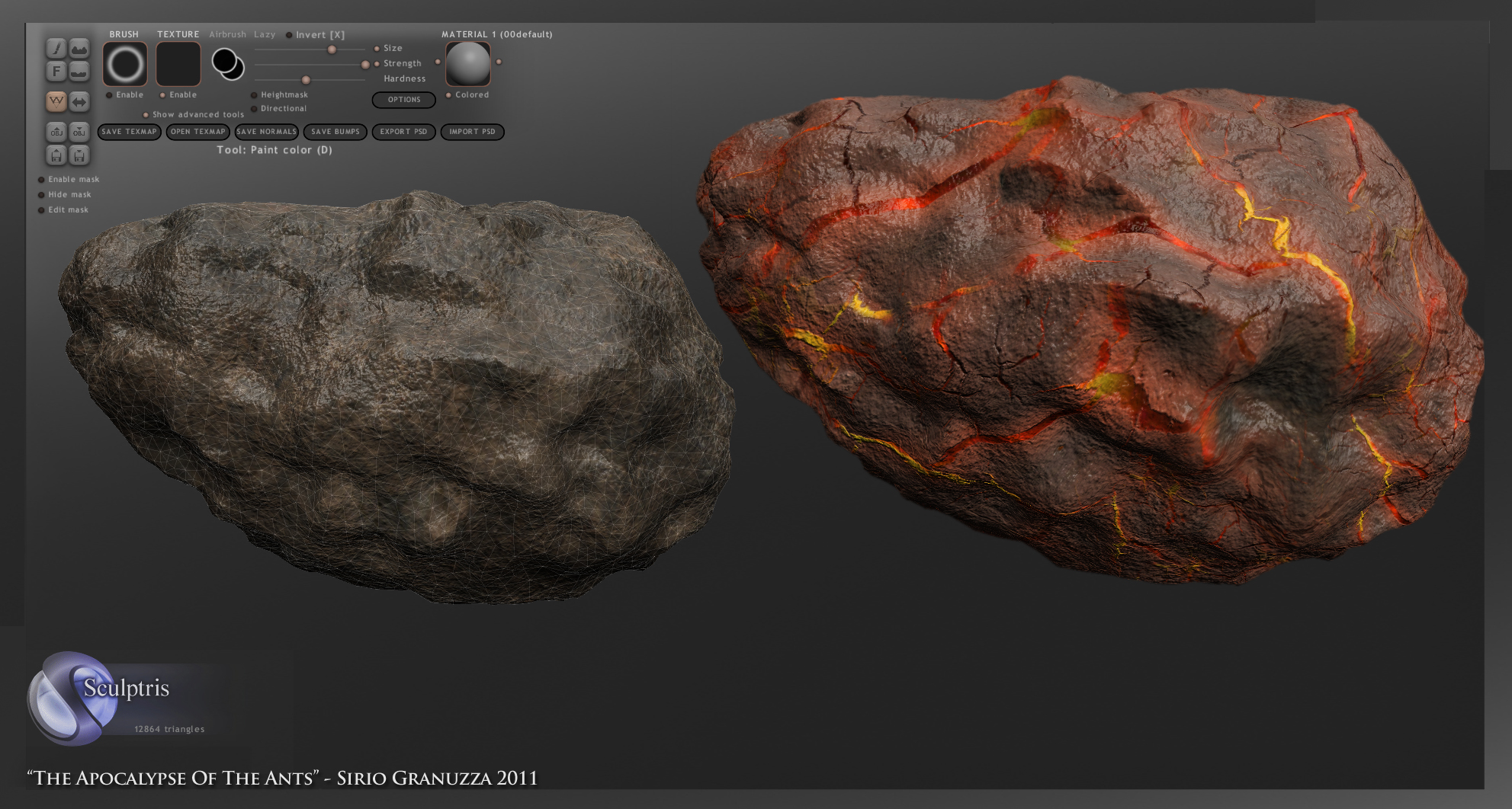 Bump e Diffuse map, i make in sculptris, but the bump map replaced with a 3dsmax smoke generator for some problems.