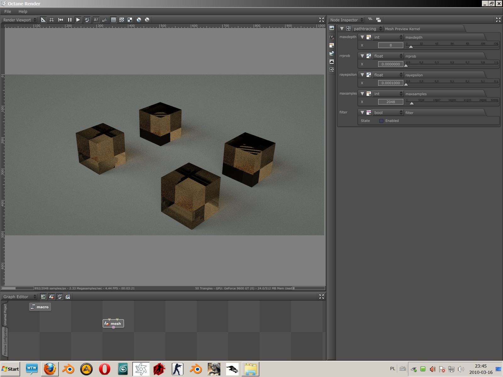 Second thing is the pathtracing when i change from a directlighting on the path my monitor shuting down and there is bluescreen . It happens in mid scenes like classroom . I don't think that it is from my memory becouse in 800x600 it take lower than half of video memory (i have gddr2 if it matters). I exporting scenes like radiance shows (without edges and with normals HQ etc).