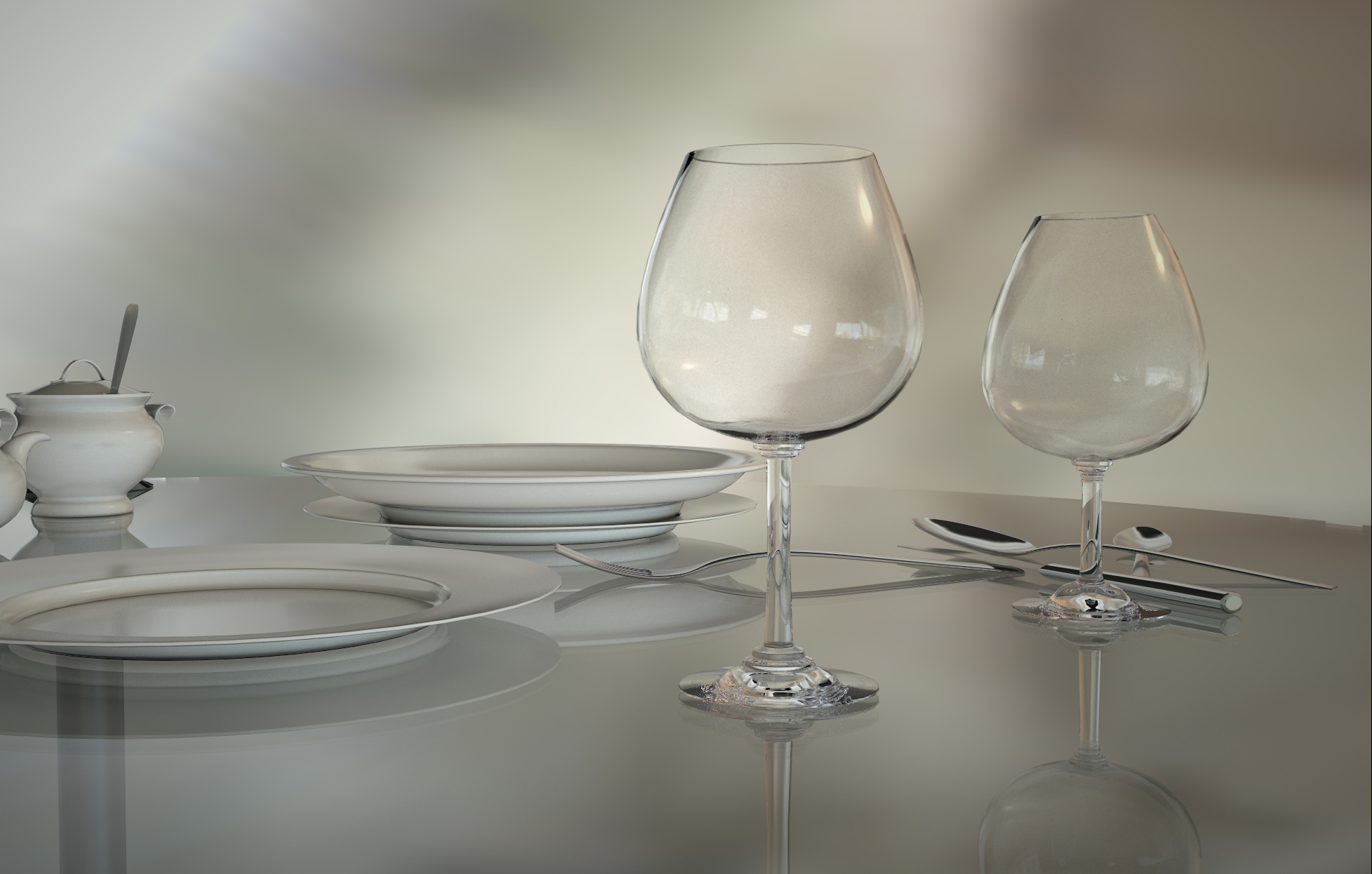 For the image with glasses and else, I noticed something weird : At first glance, I thought that the table was made of glass, because there is a gap between the glasses and their reflection, but if you look at the fork, you can see that there is no gap between the object and its reflected image. So, the most probable explanation is that the glasses are not in touch with the table...