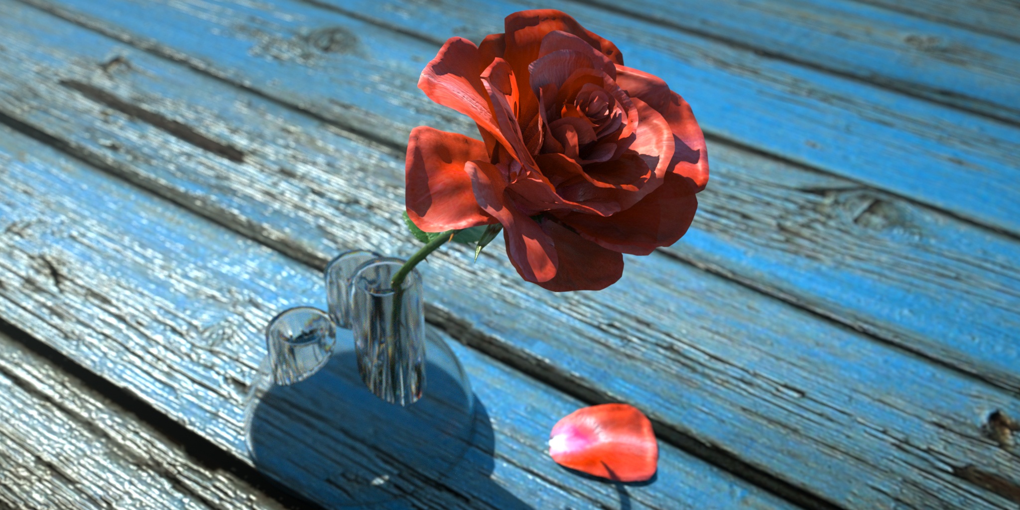 the rose should have a diffuse material + 0.25 of transmittance + 0.5 of scattering light + 0.2 of absorb + 0.2 of glossiness (mix)