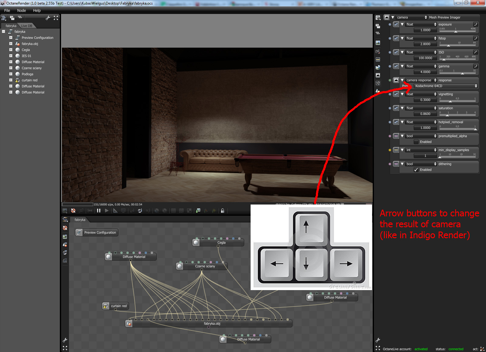 The same problem as in first point. Until you find the righ camera response you have to do a lot of clicking. It would be easier to do one big list of cameras and by pressing the arrow keys on the keyboard chose the best one. The same solution is in Indigo Render - I take a first camera from list and by pressing down arrow button I can see the result of next camera.