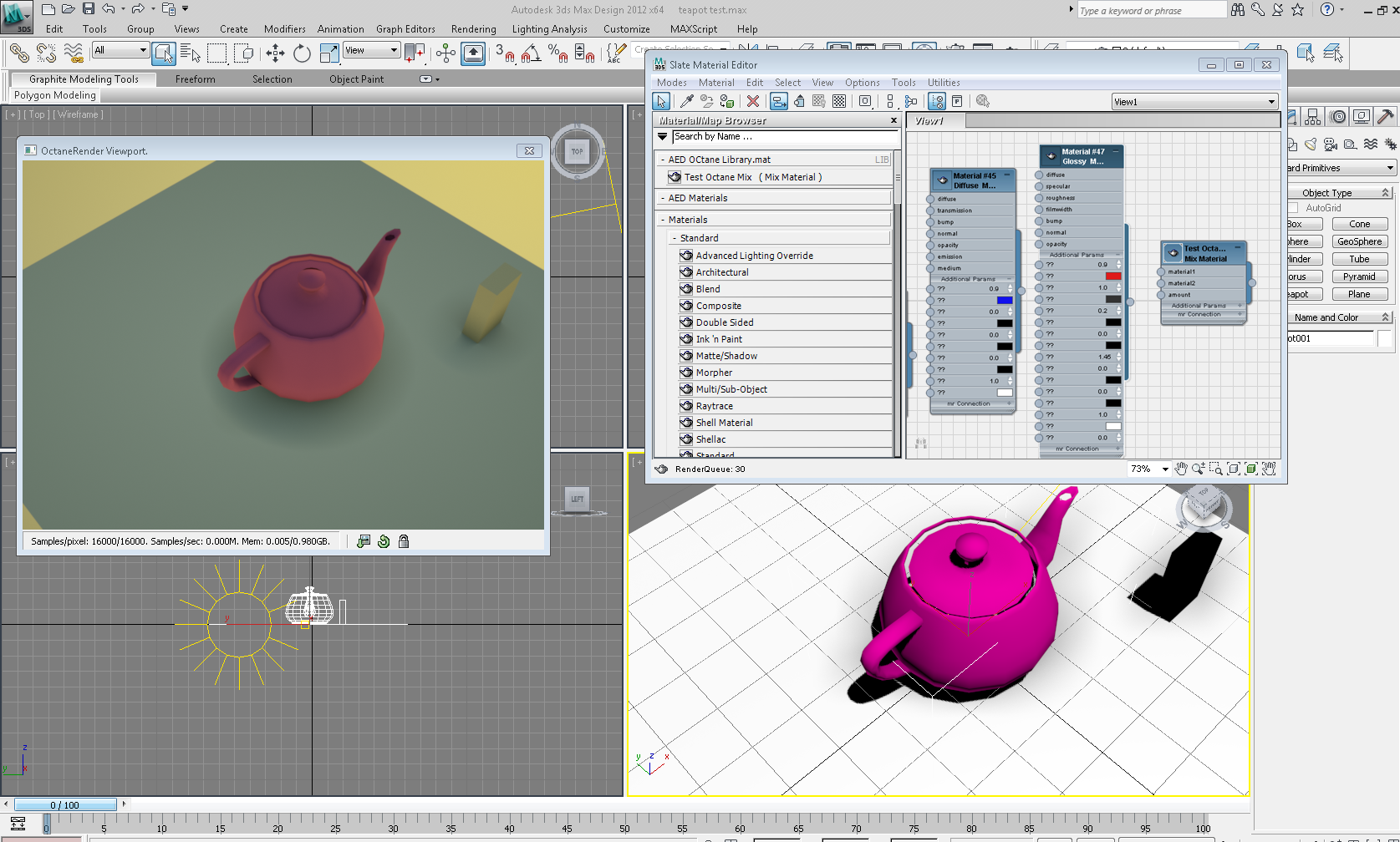 Thanks for looking at this. Attached are some photos for each condition and the teapot scene. The small box to the right hand side of the teapot has no material applied in any photo.