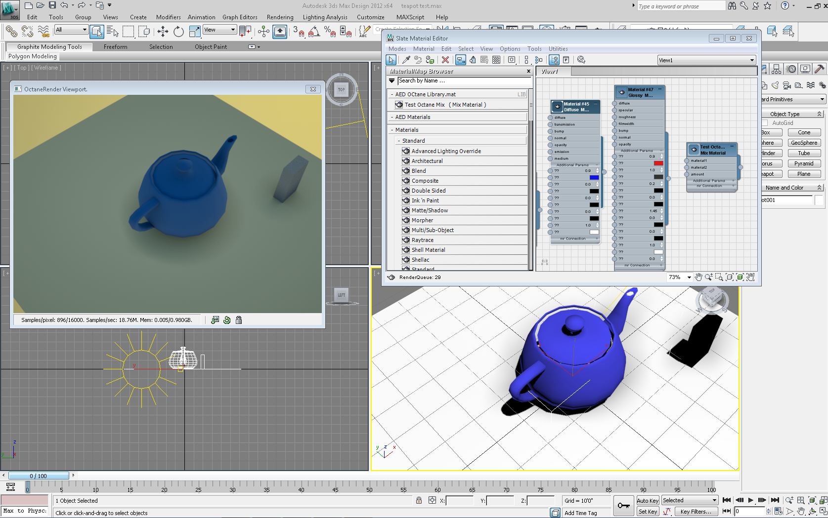 I have the OctaneRender Viewport selected and open from the beginning. Direct Lighting Kernel.