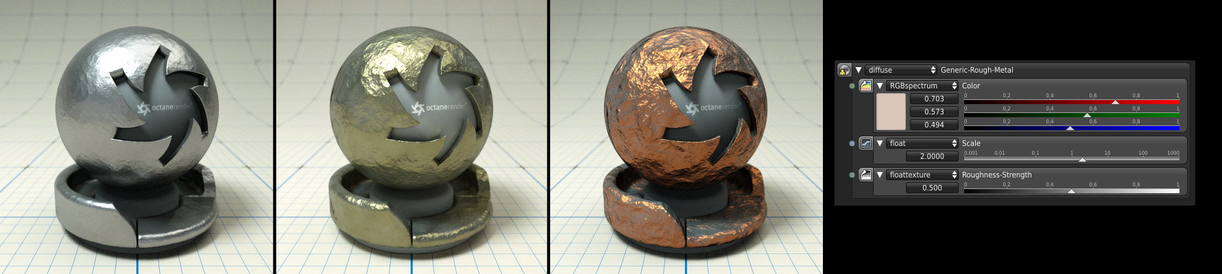 A generic rough metal material. By tweaking the Color parameter you can simulate different metals (plain, bronze, copper..). Scale controls scale and Roughness-Strength controls the bump.