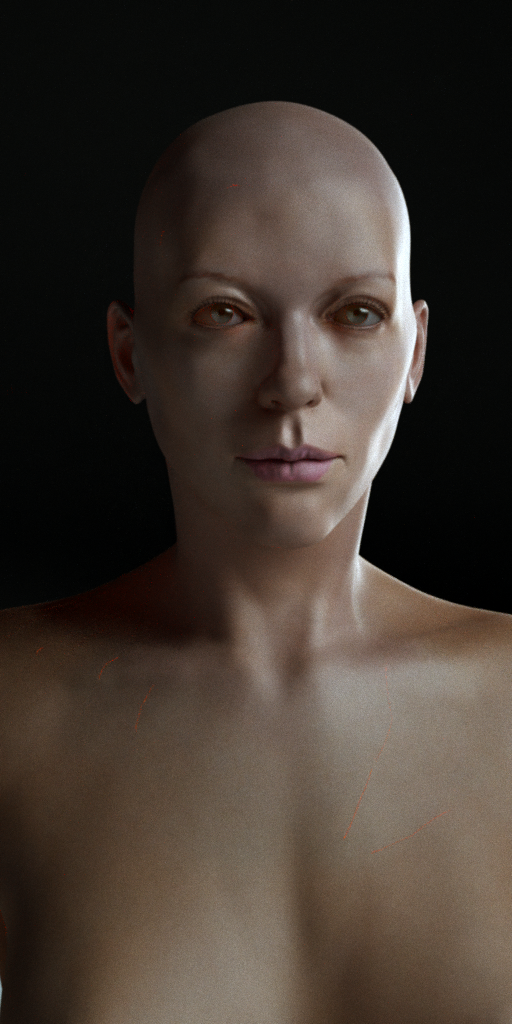 Great model and awesome texturing, I think you are spot on with the shader. It looks as she's going to talk any minute now!