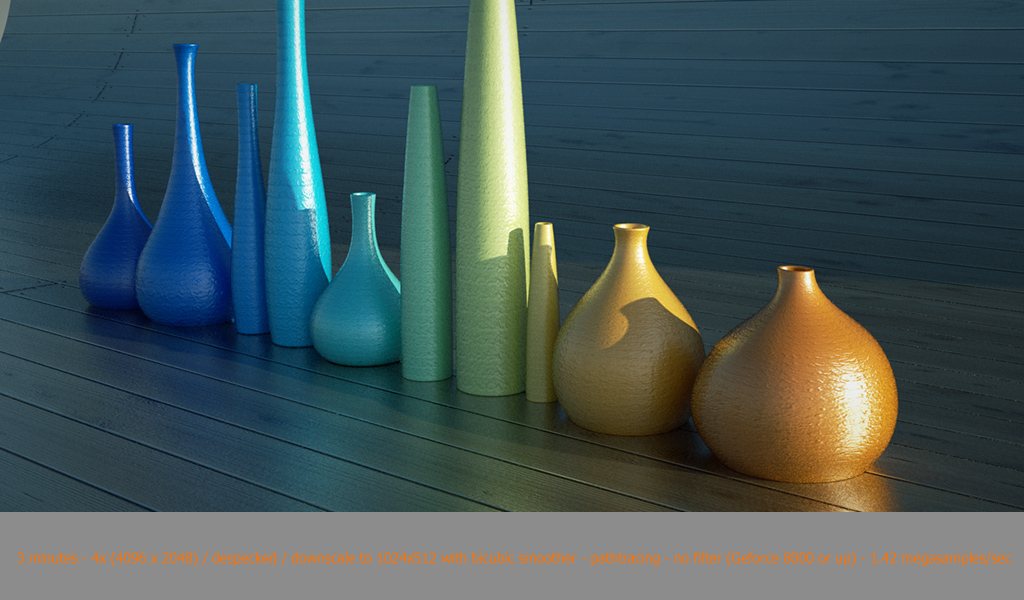 The 3rd image uses this technique, it has nearly no fireflies, smooth antialiasing, does'nt require a 9000 or higher GPU, and renders faster.