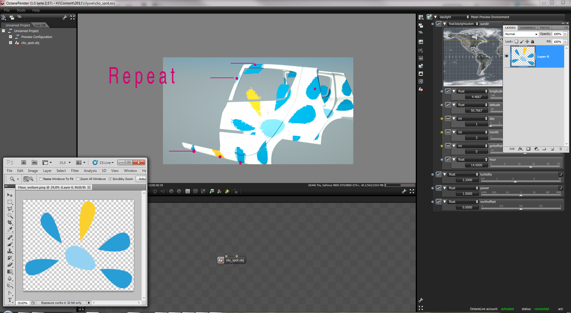 i would like to apply a png or tga 32bits file on a 3D car. But, in octane, this texture appear not correctly as you can see in the joint file. (the red point show you what i don't want)