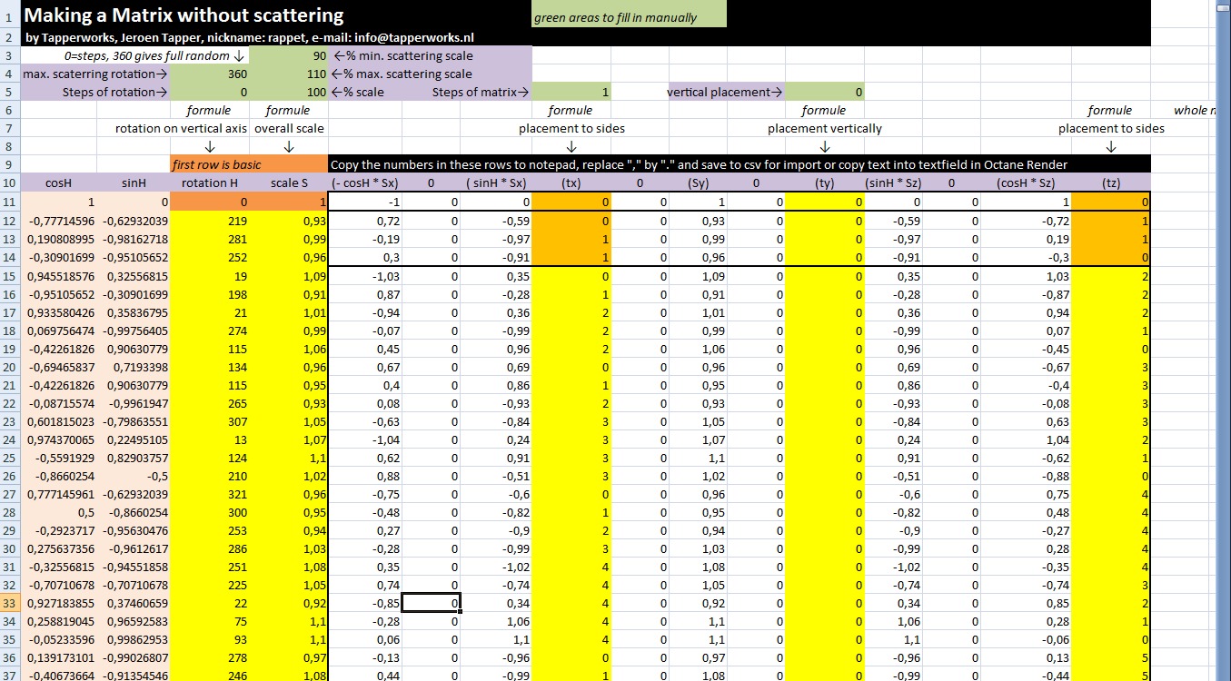 I am working on a excell to make rows and matrixes for making a csv file: works for me in Octane and does not depends on 3d-modeller.