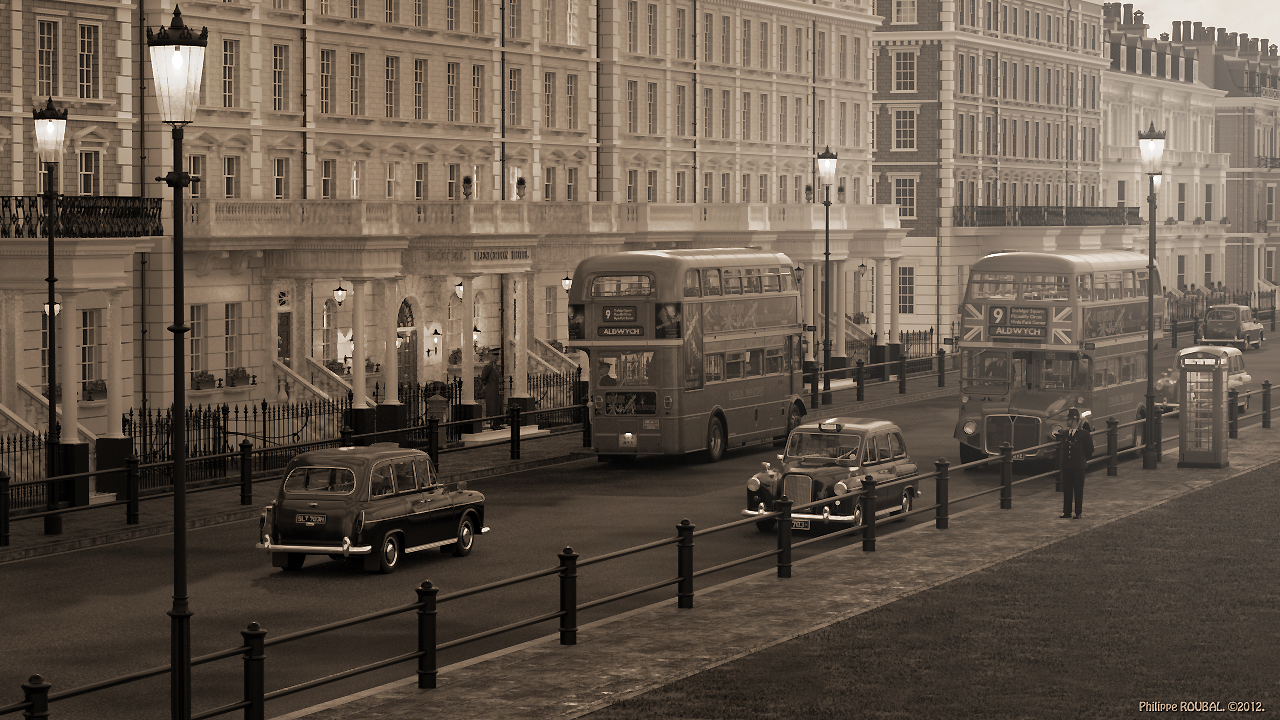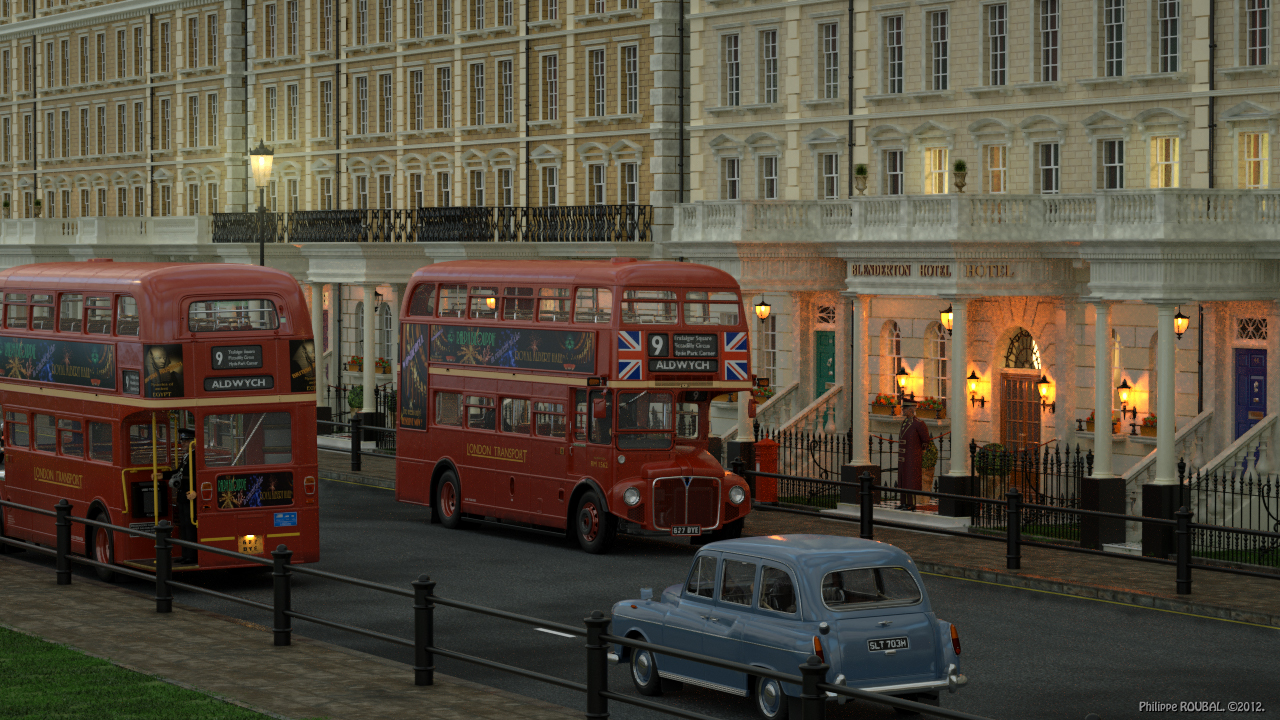 So far, I have modelled the Routemaster bus, the Austin FX4 taxi, and four luxury cars : from left to right on the rough renders below : Bentley S2 1962, RollsRoyce Silver Cloud II 1959, Rolls Royce Phantom V 1960 and Rolls Royce Phantom V 1966.