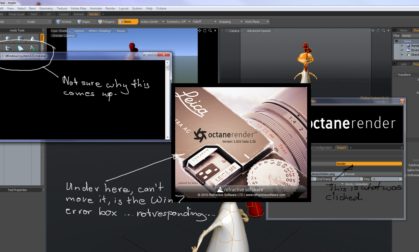 regarding the cmd prompt, that's the port that launching octane. so if modo hangs, during single frame rendering, then just close the cmd.