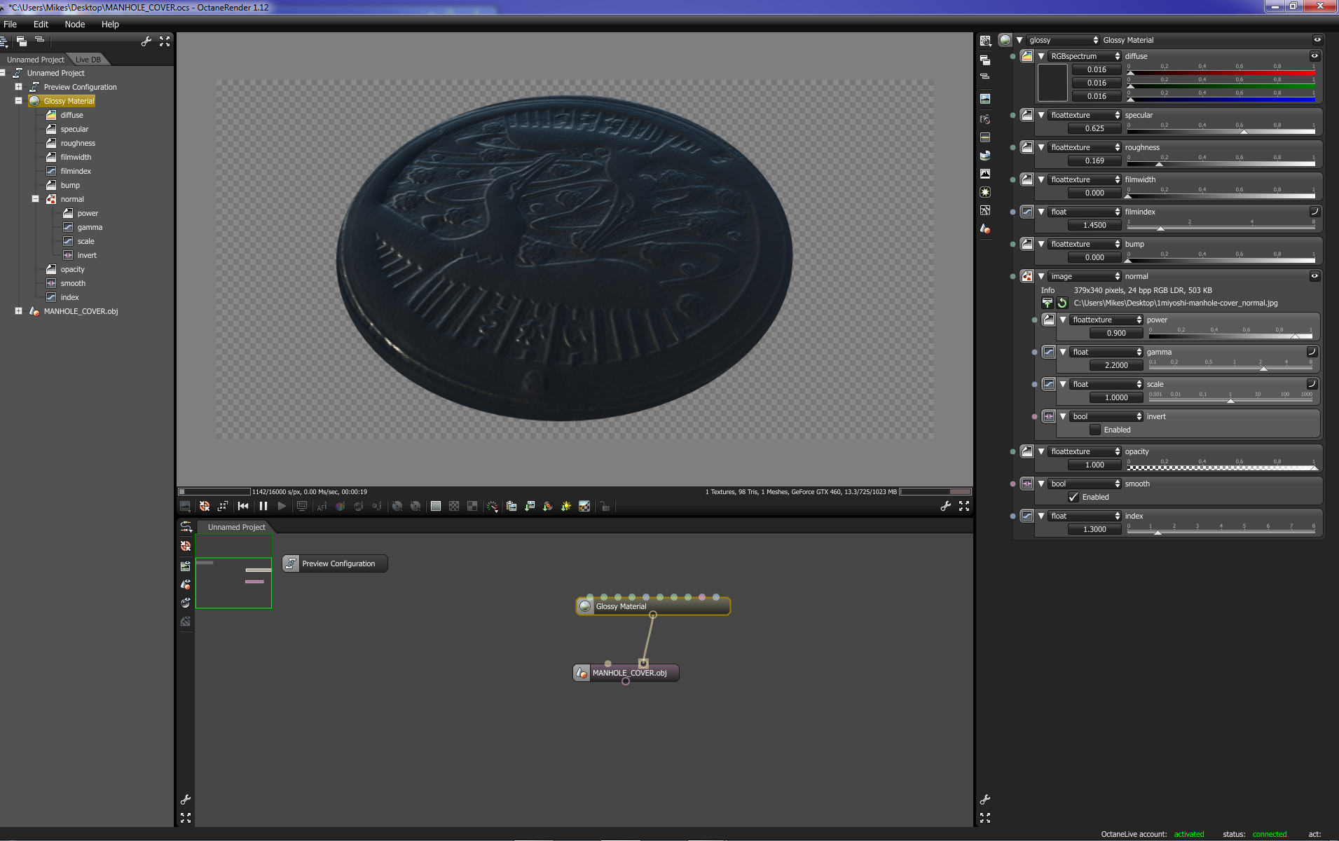 I created a normal map from a low resolution photo of a manhole cover I pulled off the internet, then applied it to a flat disc mesh in Sketchup and exported to Octane.I then applied a glossy black and the normal map in octane.