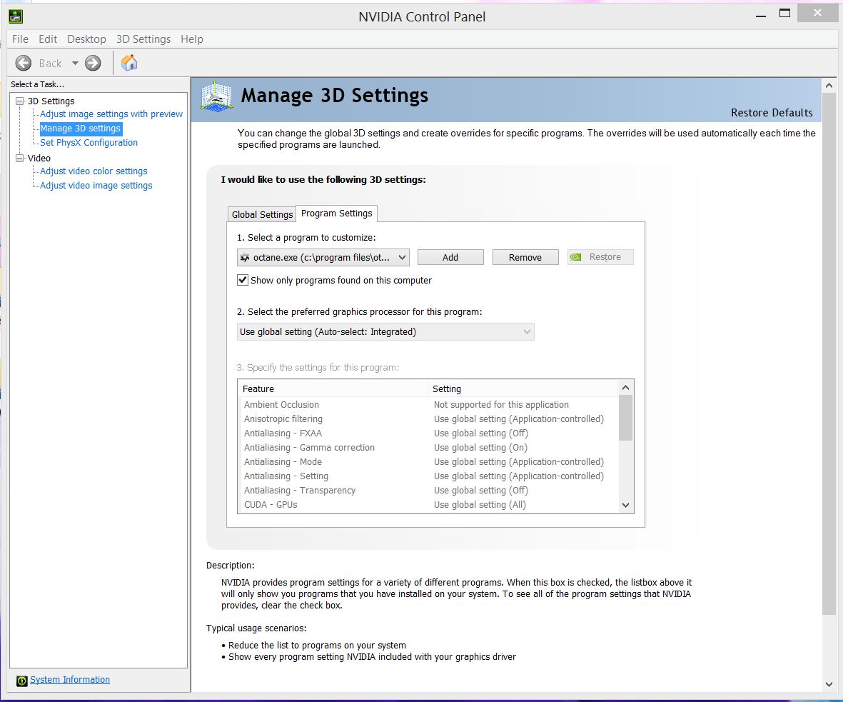 - I dug around in the graphics card settings on this computer and tried to add Octane stand alone to the preferences tab. In theory it should have allowed me to specifically tell it to use the CUDA card but it does not. It defaults to the Intel card and does not allow me to change it. Screenshot included.