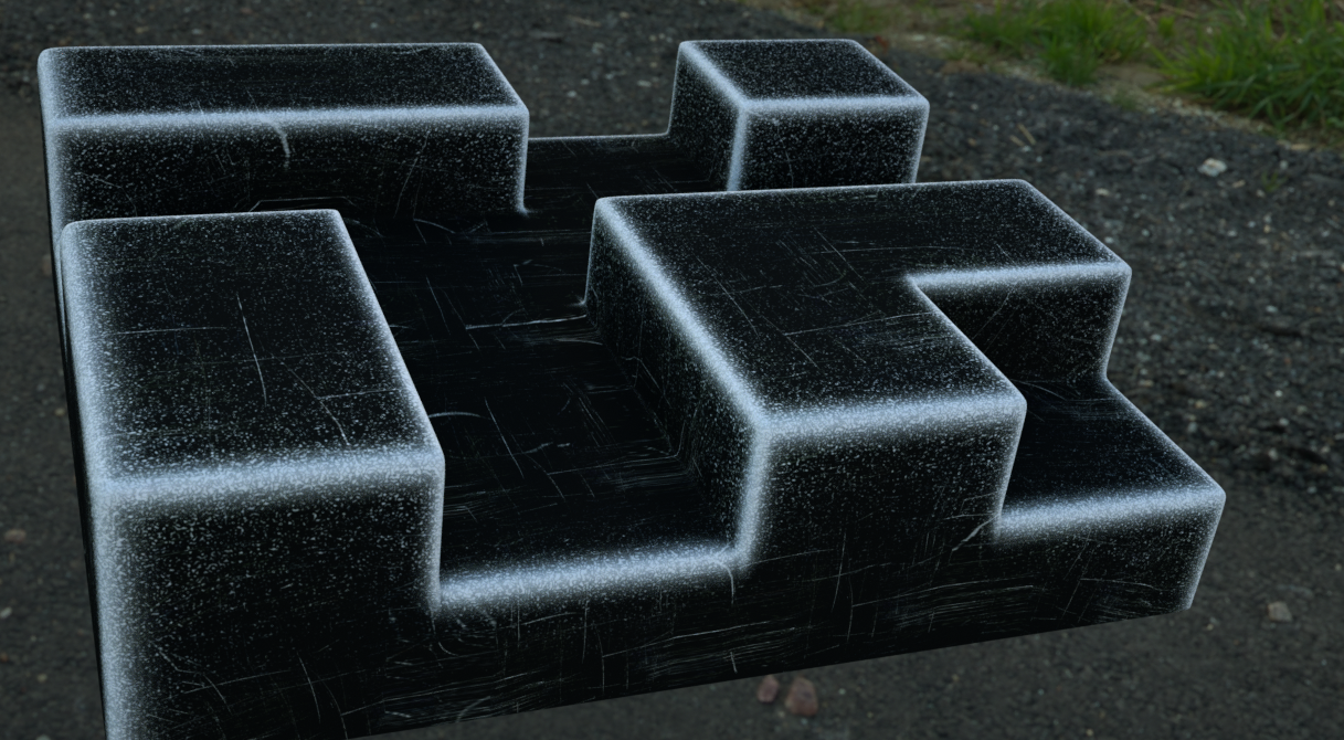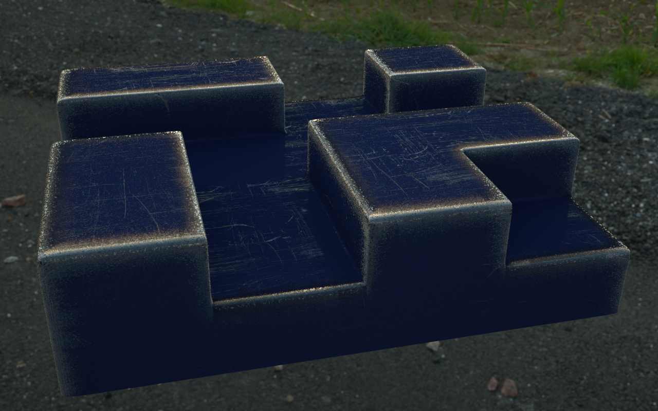 And to show you what kind of thing I'd use this for, the image below is the bump map for teh coloured version above. It has a Dirt map multiplied with a Procedural, output then multiplied with another Dirt Map to make the edges solid white, doubled, then this output multiplied with scratch map, again doubled.