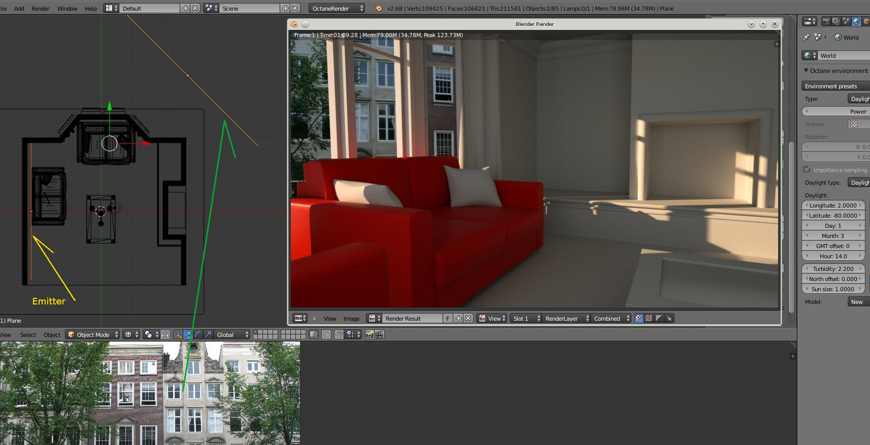 I use sunlight and a background map for the street and add a big emitter behind the camera to add more light to the scene.